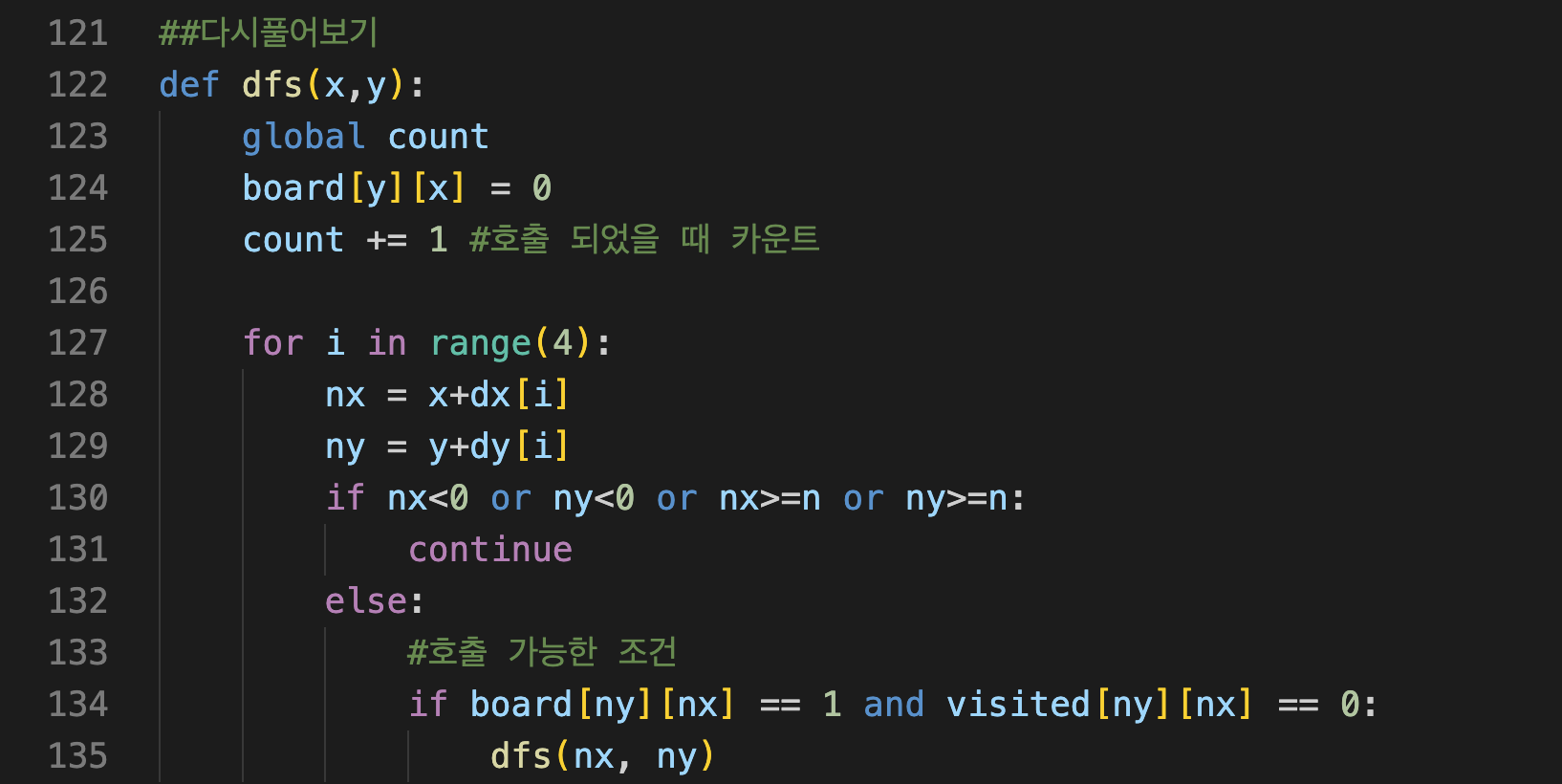 본래에는 for문 안에서 하위 함수를 호출하기 전에 카운트를 해주었다. 이렇게 했는데도 예제 출력값은 제대로 나왔으나 이상하게 틀렸다는 판정을 받았다.. 풀이를 참고하여 dfs가 호출되고 나서 카운트를 해주도록 코드를 수정하였더니 정답 판정을 받을 수 있었다.