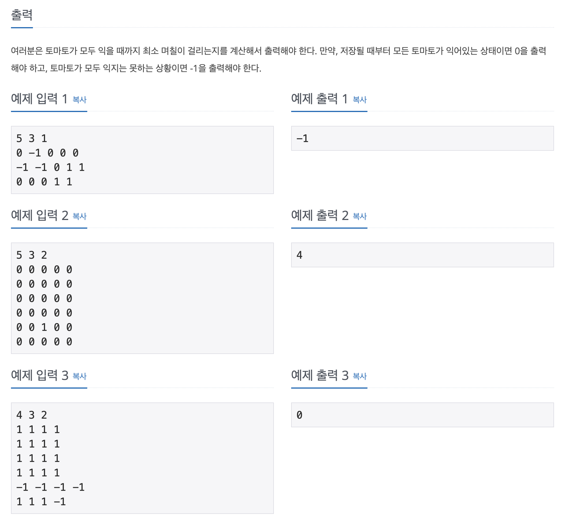 이전에 풀은 백준 7576 토마토 문제와 비슷하지만 3차원 리스트를 활용해야 하는 문제. 3차원 리스트를 연습할 수 있어서 좋았고, 며칠 뒤에 다시 한 번 풀어봐야겠다.