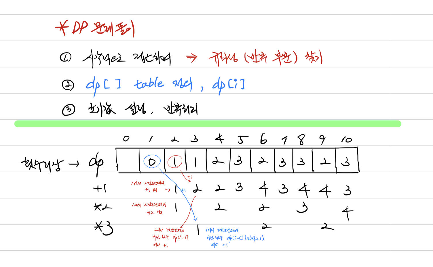 dp[i] = dp[i-1] + 1 # 1로 더하는 경우 (dp[i-1] + 1) -> dp의 값에는 최소값이 저장되기 때문에 가