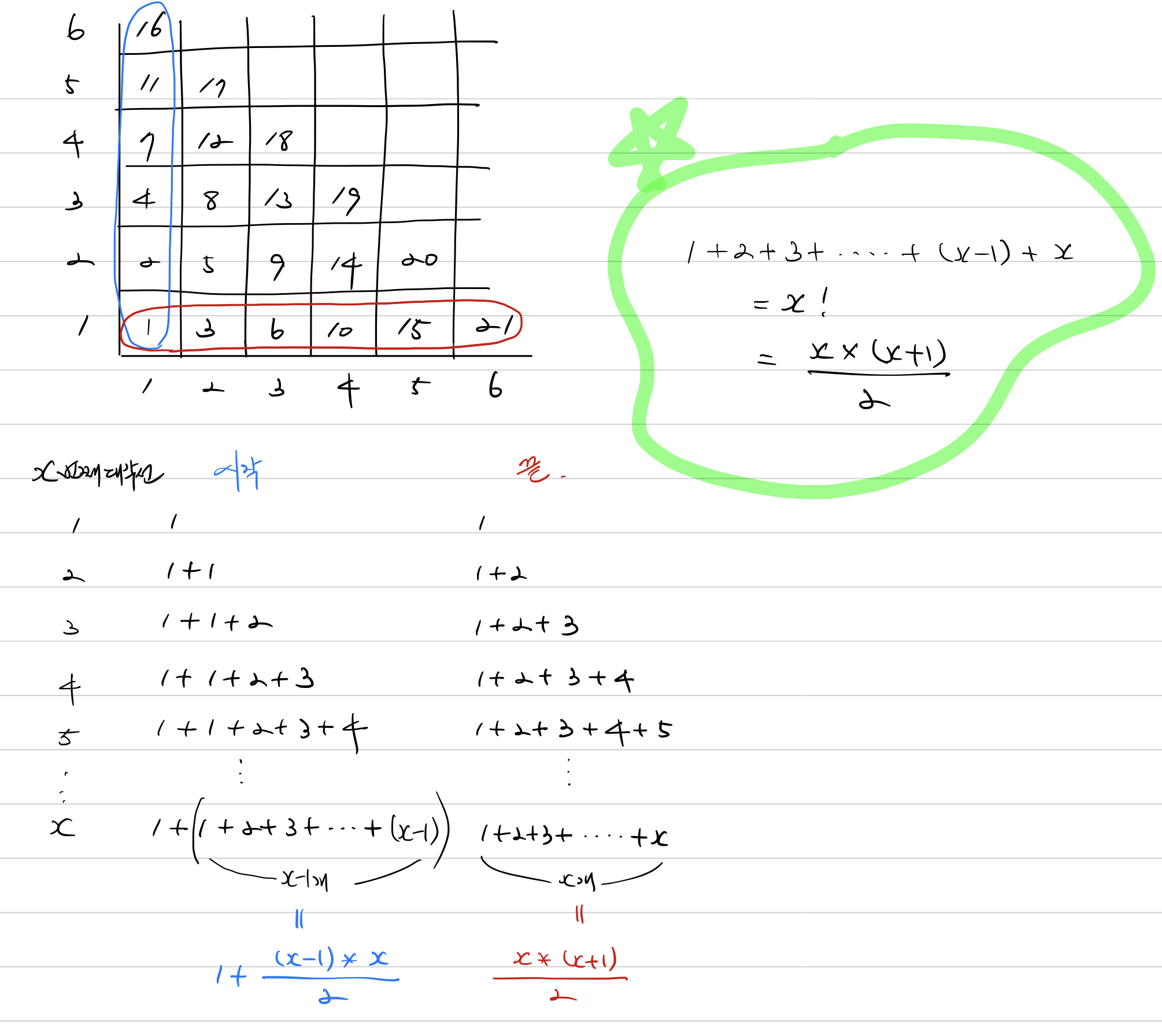 - 대각선의 시작점과 끝점의 규칙을 찾아서 주어진 입력값(숫자)가 몇 번째 대각선에 속하는지 찾을 수 있다.
