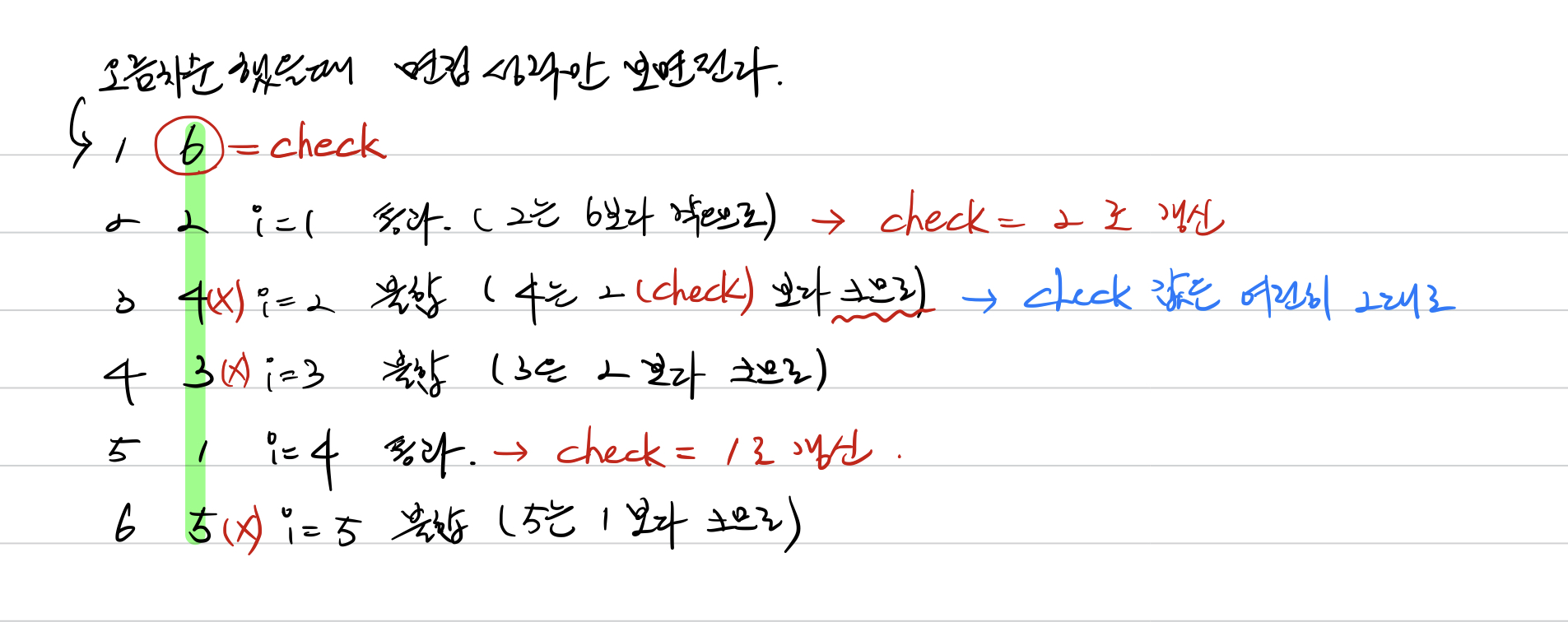 - 그리고, 주의할 점은 다음 사람의 면접 성적을 이전 사람과 비교할 때, 합격한 사람 기준으로 면접 성적을 비교해야 하므로(왜냐면 이미 불합격한 사람은 면접 성적을 비교할 필요가 없다.) check 변수에 합격한 사람의 면접 성적을 갱신하여 저장한다.