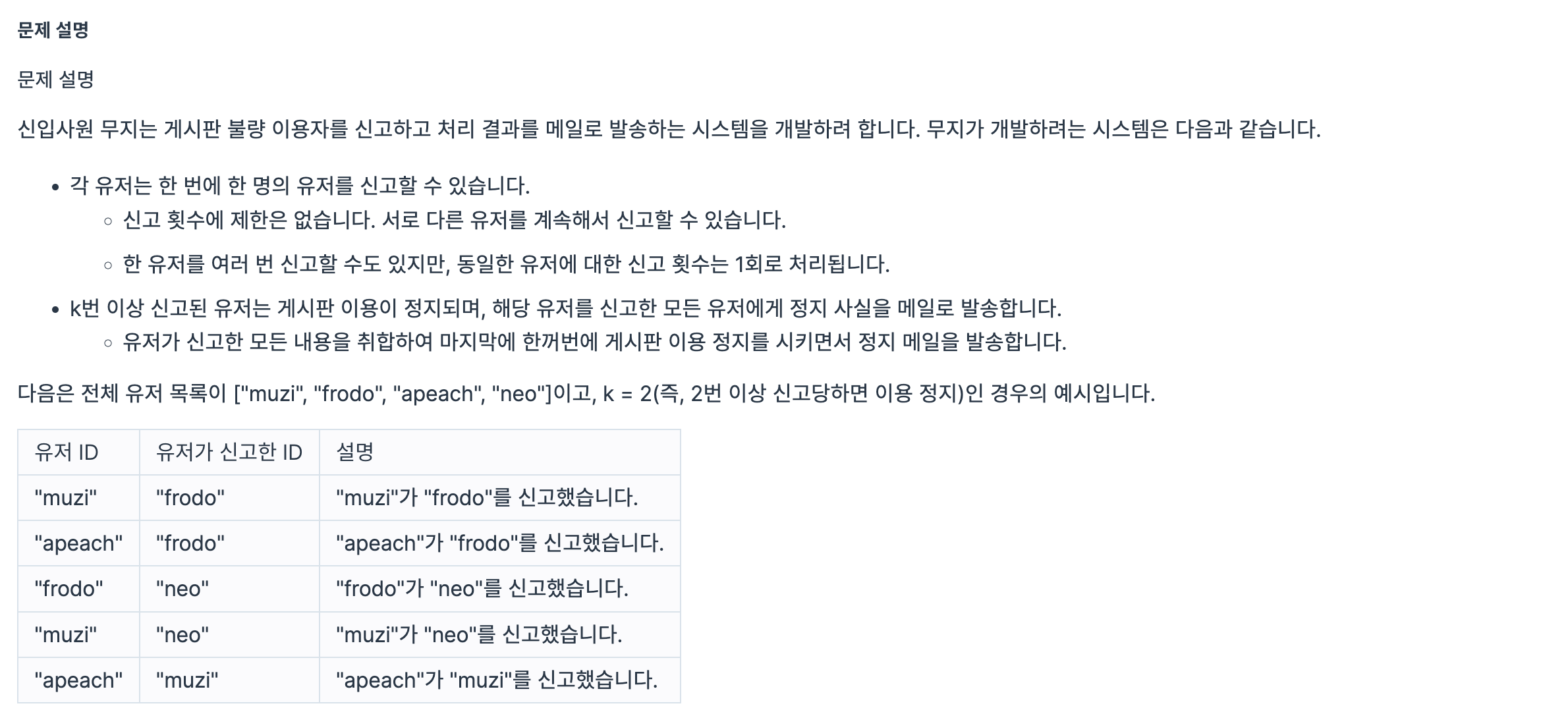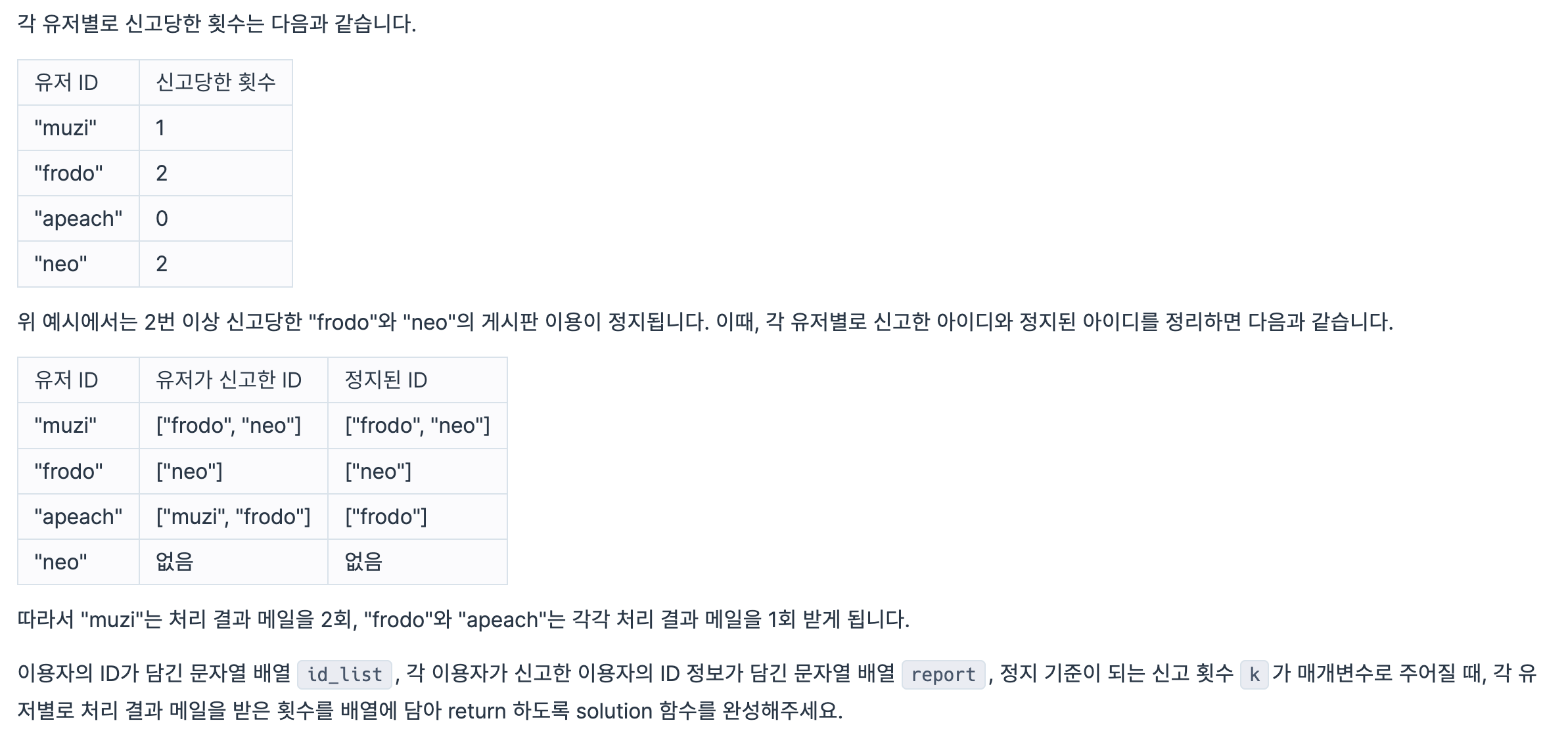 #각 유저가 k번 이상 신고당한다면, 그 유저를 신고한 사람에게 메일이 전달되고,