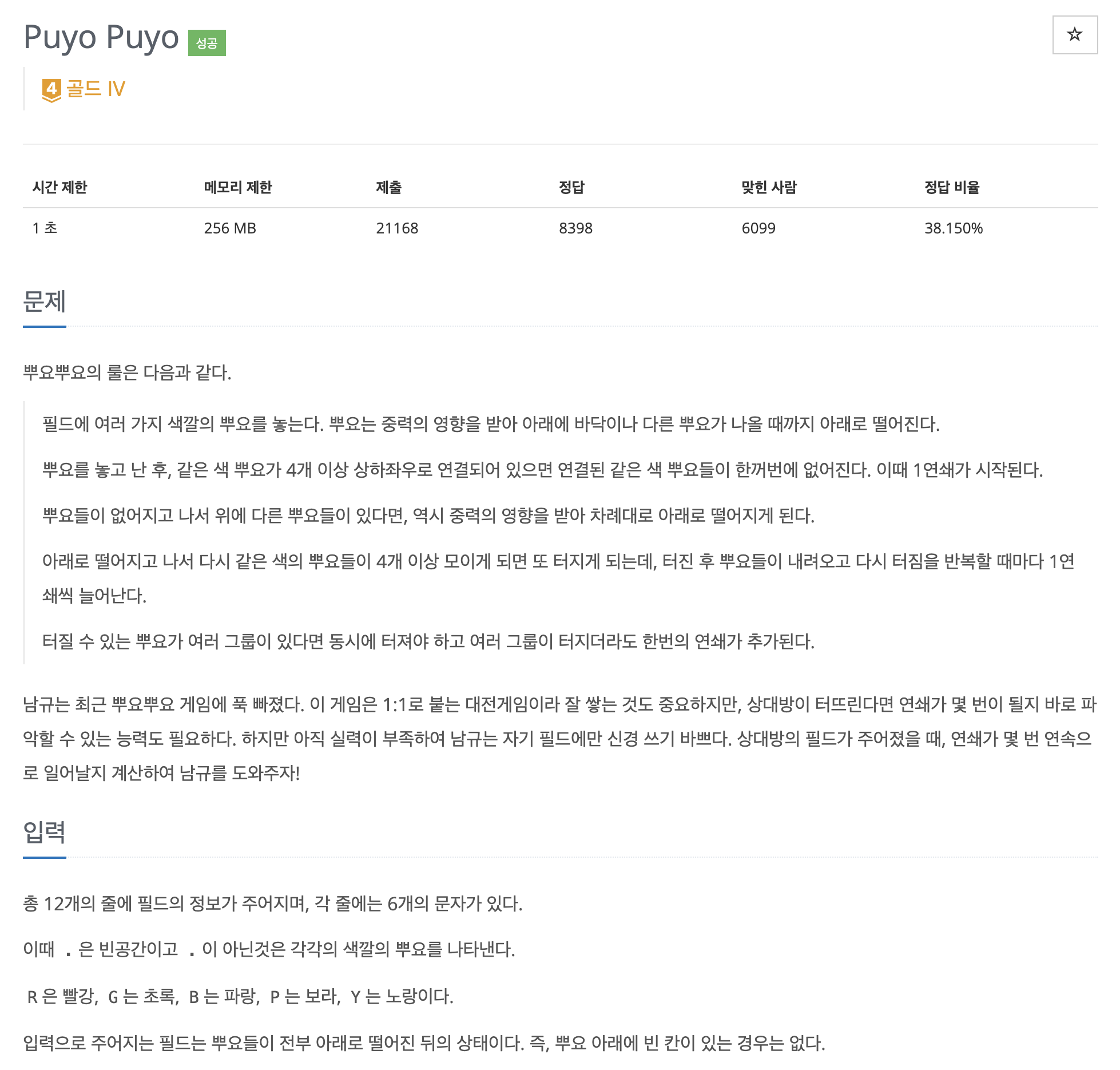 DFS를 활용하여 문제를 해결하였다. BFS를 활용하여 문제를 풀었다면 실행시간의 이득을 볼 수 있었겠지만, BFS보다 DFS의 숙련도가 낮다고 생각해서 DFS로 문제풀이에 도전하였다. 재밌게 풀었다. 처음엔 뿌요들을 아래로 내리는 코드를 잘못 작성해서 틀렸지만, 스택을 활용하여 다시 풀었고, 정답 판정을 받을 수 있었다.