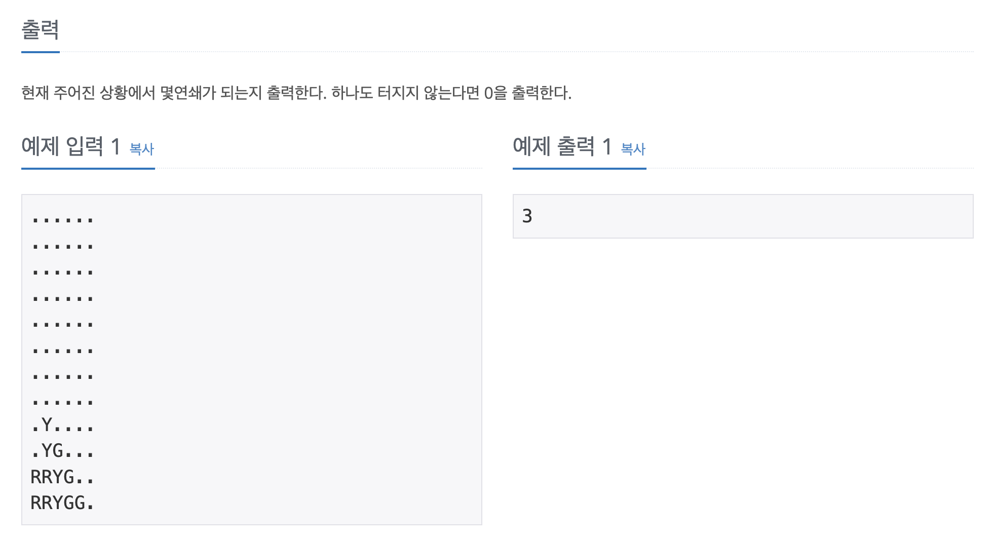 - DFS로 연결된 뿌요들의 좌표를 구하고, 4개 이상 연결된 뿌요들을 터뜨리고 나서 공중에 떠있는 뿌요를 아래로 내린다.
