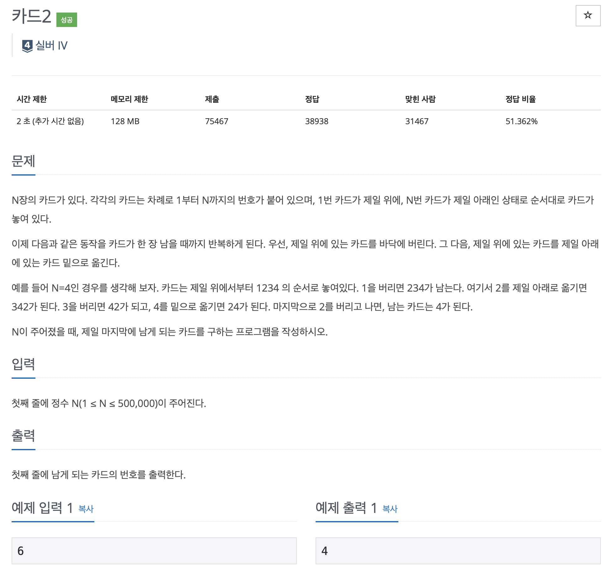 - card : 카드를 넣을 리스트를 생성한 후 반복문으로 1부터 N까지의 수를 card 리스트에 저장한다.