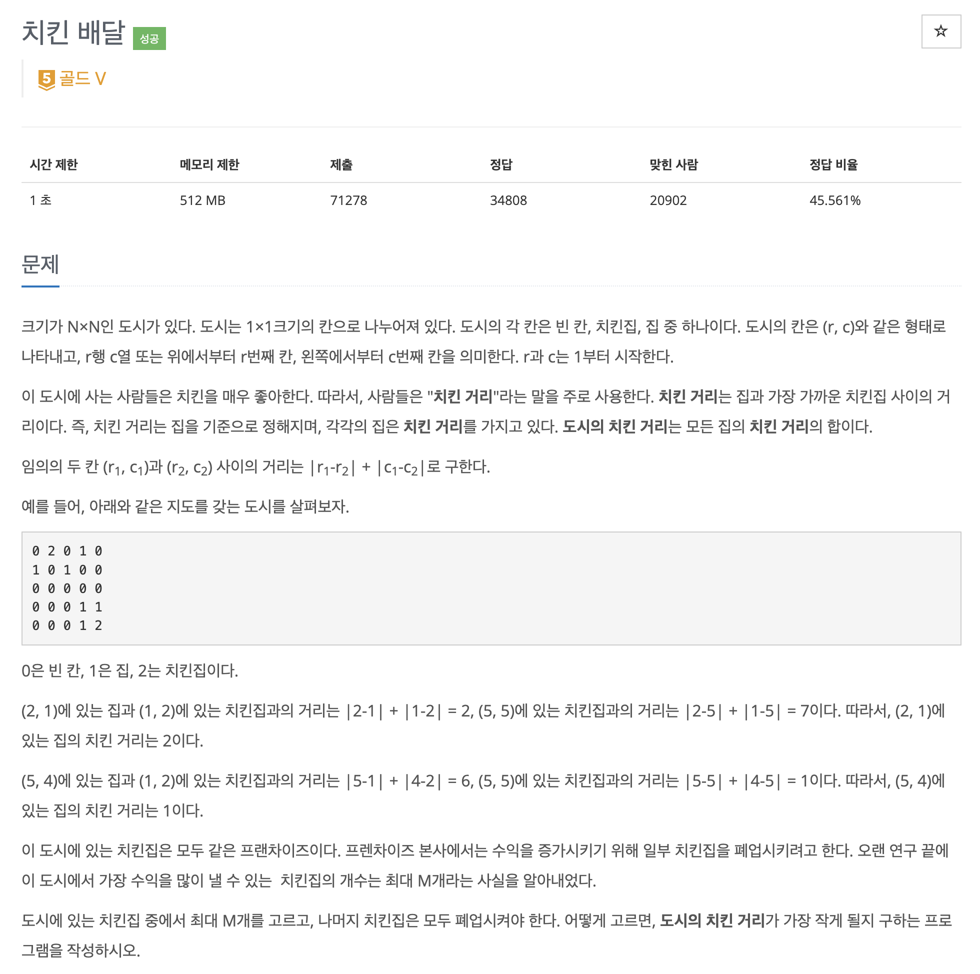 - 백트래킹을 활용하여 가능한 m개의 치킨집 좌표 케이스들을 저장하고, 하나씩 탐색하며 최단 치킨거리를 찾는다.