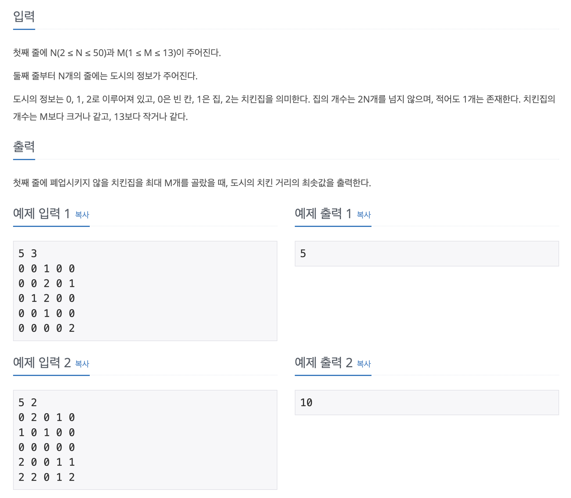 ans = [] #폐업하지 않은 치킨집 좌표를 탐색하며 각 케이스별 최단 치킨거리를 저장한다.