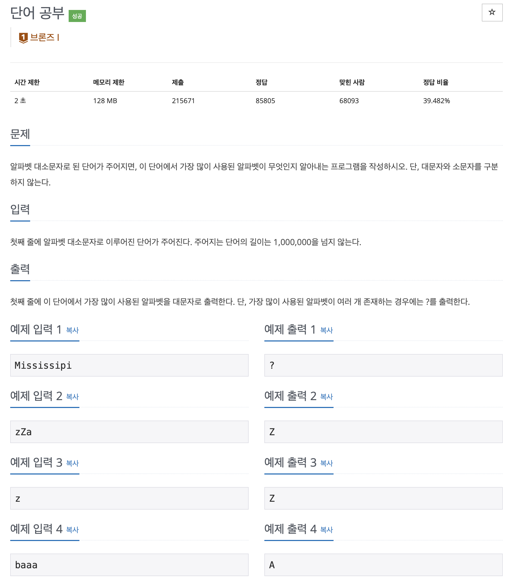 - cnt에 저장된 cnt의 최댓값이 2개 이상인 경우 "?"를 출력한다.
