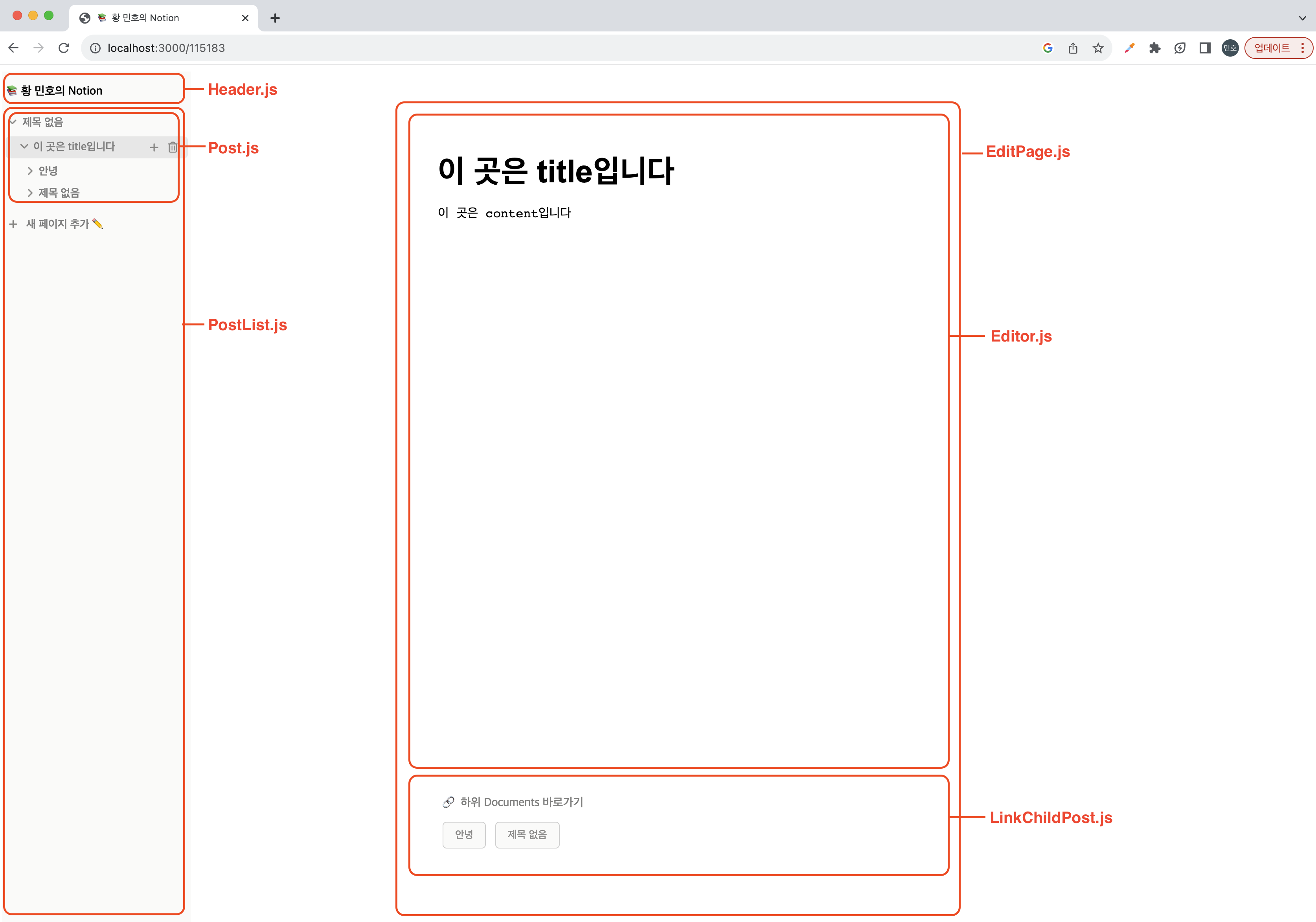 HTML 레이아웃은 크게 두 가지 영역으로 구분되어 있다. 왼쪽(side-bar)에는 Header 컴포넌트와 API 통신을 통해 저장된 Documents의 목록을 보여주는 PostList 컴포넌트가 존재한다. 오른쪽(edit-page)에는 선택된 Document의 제목과 내용을 편집할 수 있는 공간인 Editor 컴포넌트, 선택된 Document의 하위 Documents로 바로 이동할 수 있는 링크 버튼이 담긴 LinkChildPost 컴포넌트가 존재한다.