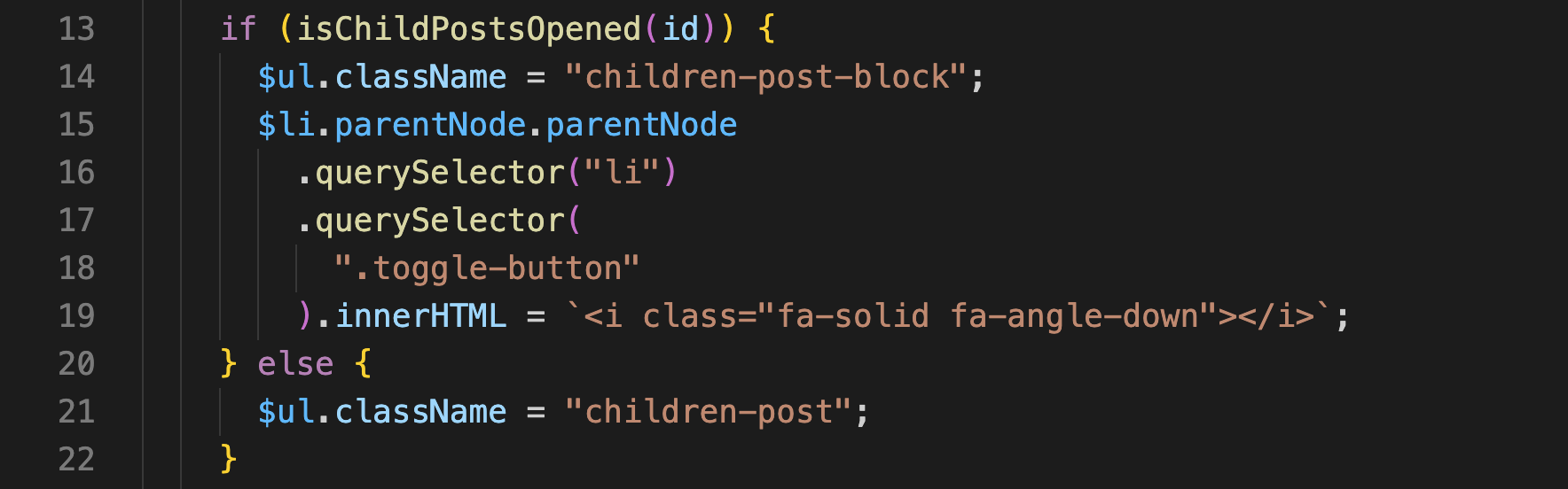 정말 오랜 시간을 투자한 만큼 다양한 방법을 사용해보았는데, 구현에 성공한 것처럼 보였어도 버그가 발생했고 Fix를 정말 여러 번 했다. 그러던 중, 상위의 Document의 토글 버튼은 하위의 Document의 id들이 로컬스토리지에 저장되어 있는지에 따라 버튼 이미지가 달라지게 되고, 따라서 재귀함수에서 상위의 Document에 해당하는 함수를 실행했을 때, 하위의 Document들의 id를 탐색하면 되겠다 싶었고, 그렇게 하려고 했으나 실패했다.