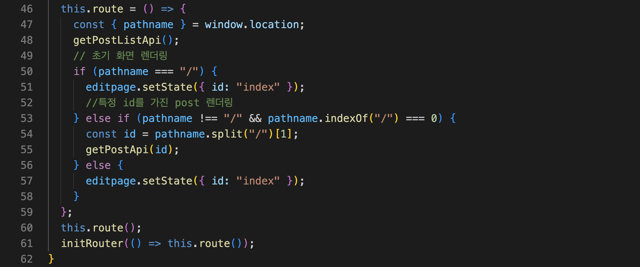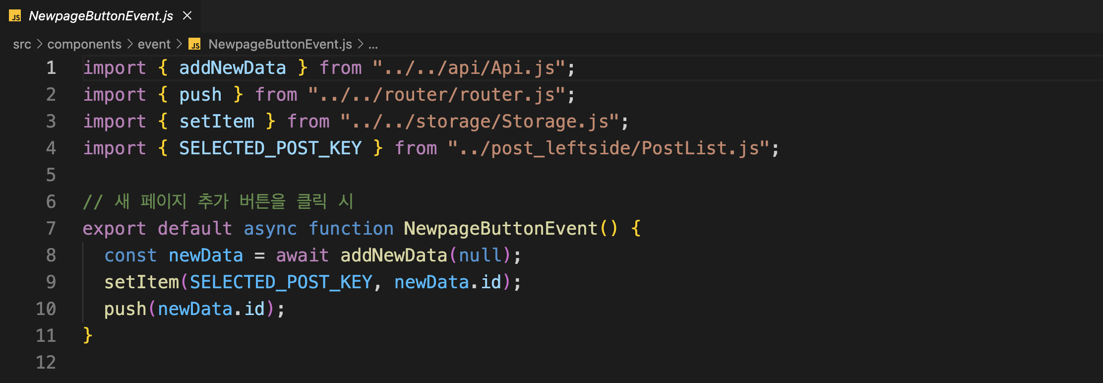 특정 Document를 클릭했을 때, URL도 변경이 되어야 하고 해당 Document의 편집기를 불러와야 한다. 따라서 router.js에서 정의된 push 함수의 파라미터로 해당 Document의 id를 전달하게 되면, CustomEvent가 생성되어 이벤트를 실행시킨다. window에서는 이벤트를 받아서 핸들러(콜백 함수)를 실행시킨다. 핸들러의 내용은 history API를 통해 URL을 변경시키고 파라미터로 전달 받았던 onRoute 함수(App.js의 this.route())를 실행시킨다. App.js에서는 URL의 pathname에 따라 상태 변경이 필요한 컴포넌트의 상태를 변경시킨다.