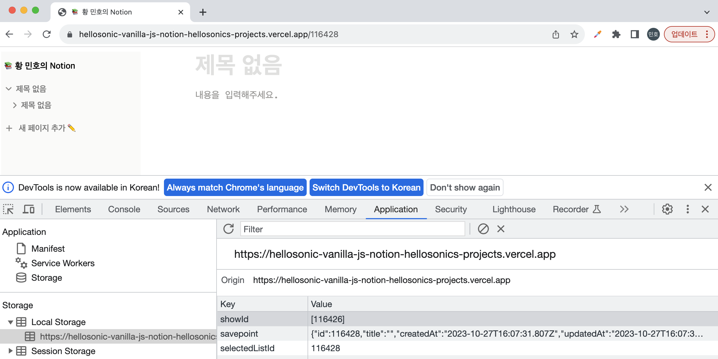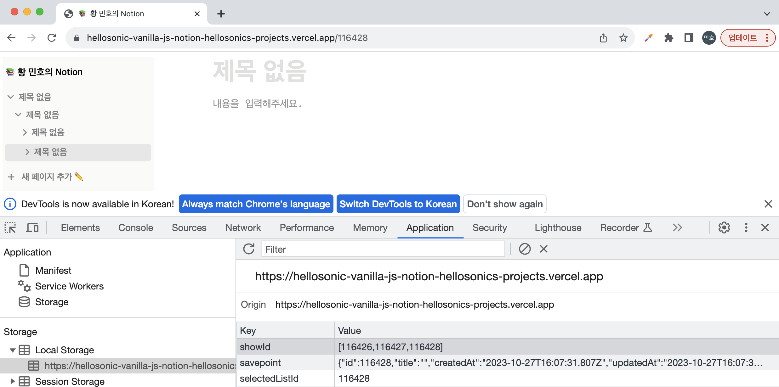 위의 사진에서 Root Document를 제외한 3개의 Document의 id들이 로컬스토리지의 showId의 값으로 담겨있다. 로컬스토리지에 id들이 저장되어있기 때문에 새로고침을 해도 로컬스토리지에 담긴 id에 해당하는 document들이 보여지게 된다.