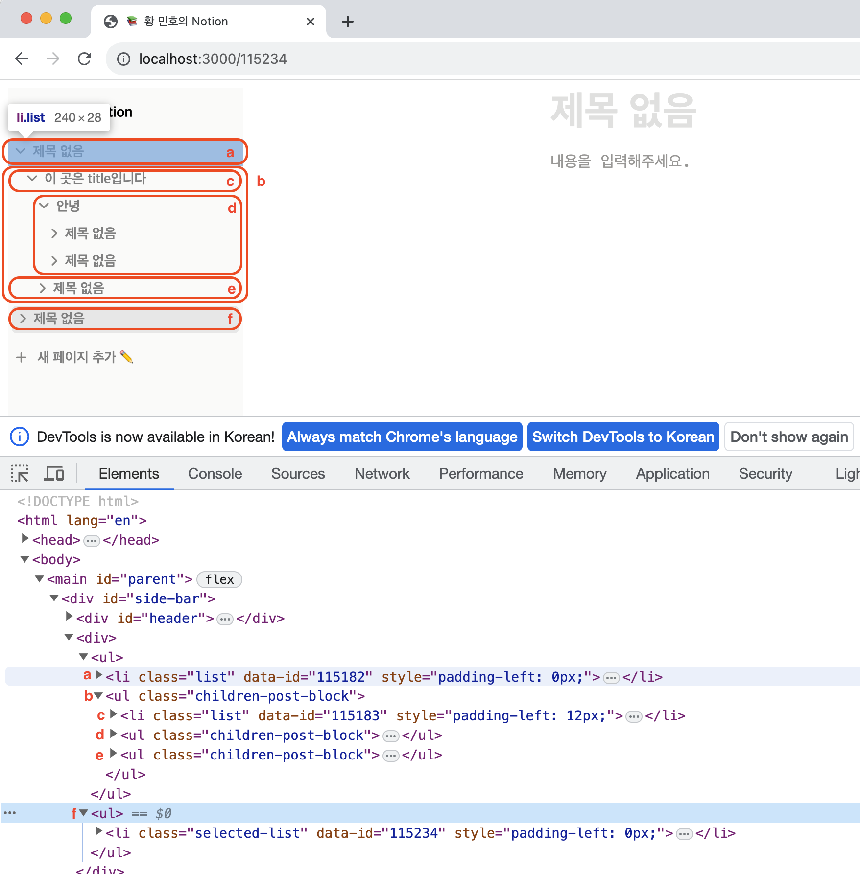 사실, 처음에는 많이 헤맸던 것 같다. 그리고 중간에 하위 Document들이 open된 상태(사진에서 'd'와 같이 하위 Document들이 보여진 상태)와 close된 상태의 상위 Document의 토글 버튼에 각각 다른 이미지를 주고 싶었는데, 초반에 생각했던 방식에서는 구현이 어려워서 재귀 함수 안의 코드들을 뜯어고쳐야만 했다.(그래서 프로젝트 초기 단계에서 디테일한 레이아웃 설계의 중요성을 깨달았다..)