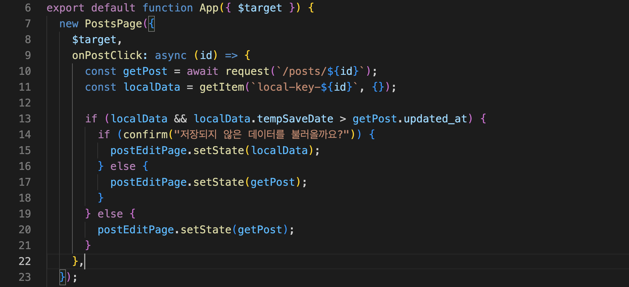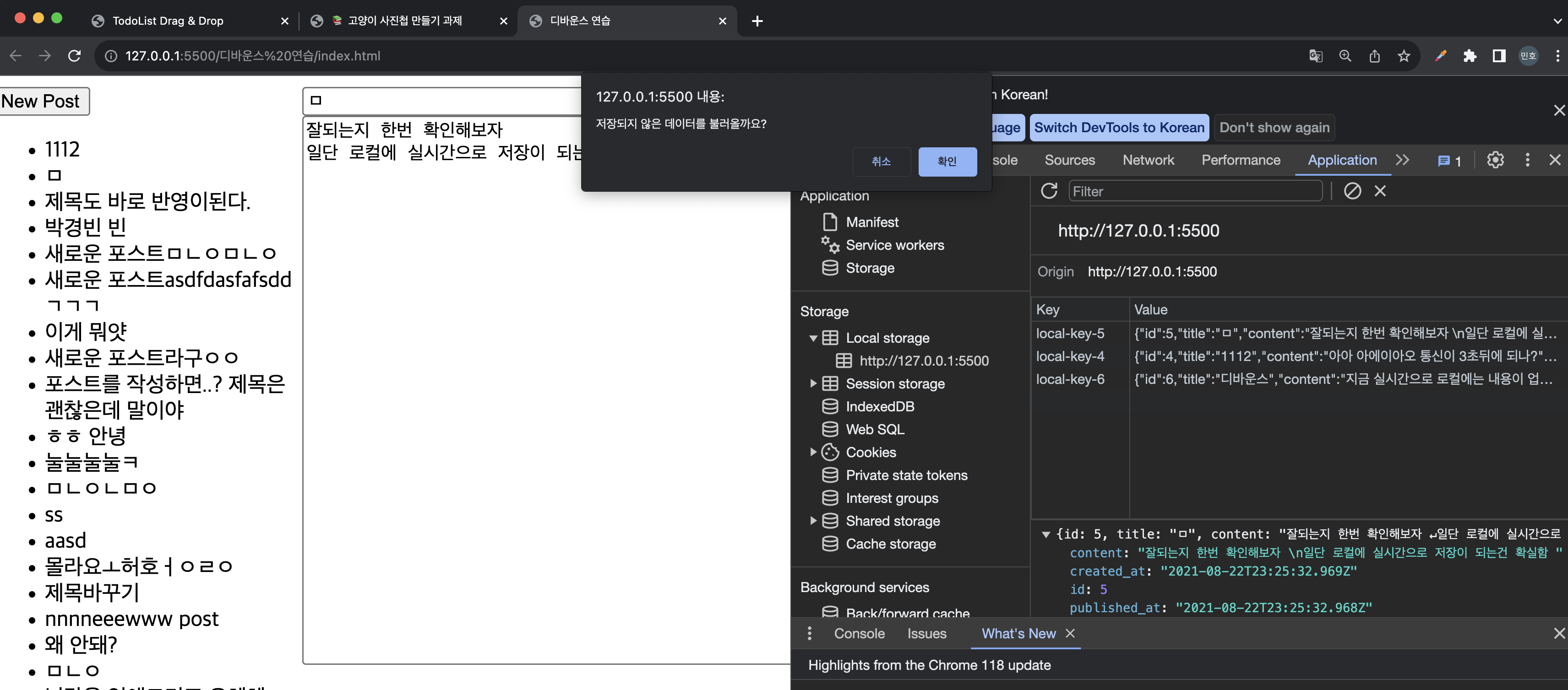keyup 이벤트 발생 시, 즉각적으로 로컬스토리지에 데이터가 저장되고 30초 후 API 통신을 통해 DB에 저장하는 코드를 작성해보았다. 또, 새로고침 시, 로컬스토리지에 저장된 작성 시간(tempSaveDate 프로퍼티의 값)과 API 통신으로 불러온 데이터의 작성 시간(updated_at)과 비교하여 더 크다면(최신이라면) '불러오기' confirm 창을 띄우고, 각 버튼에 따라 다른 데이터를 편집기에 render 하도록 코드를 작성했다.