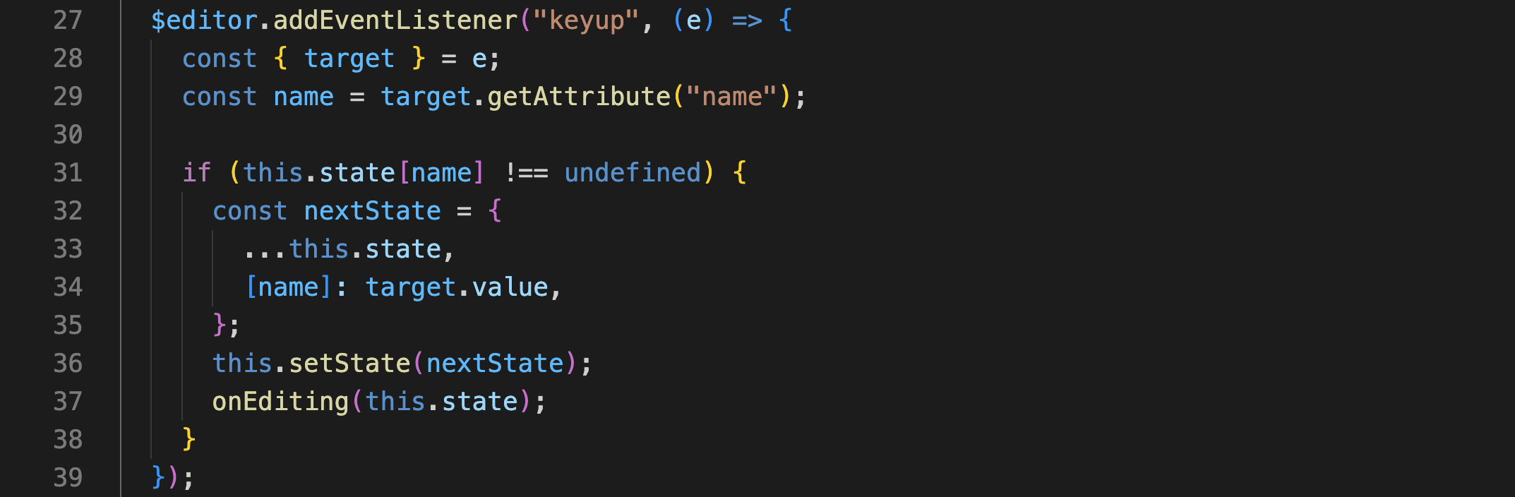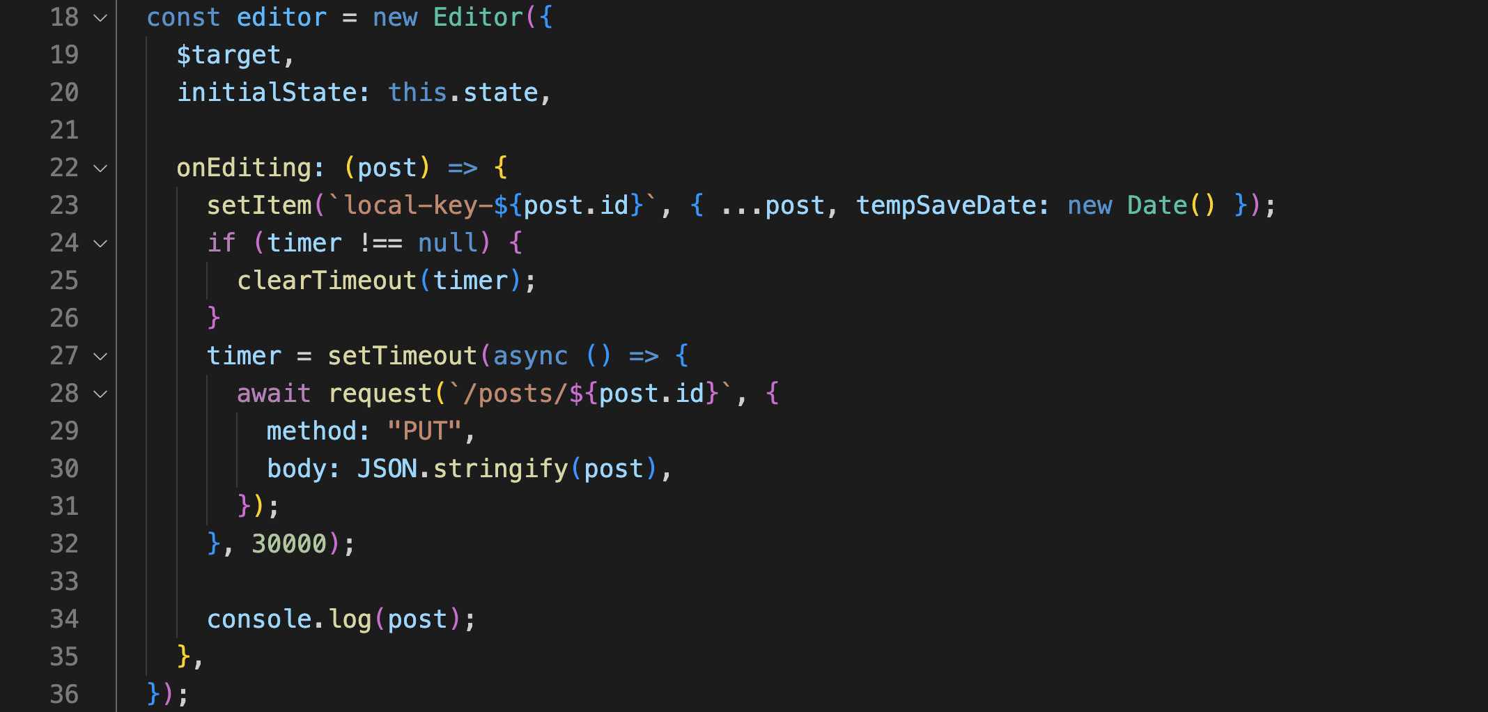 먼저, timer를 null 값으로 초기화하고, onEditing 함수 내부에 작성된 코드를 setTimeout 함수의 콜백 함수에 붙여넣고 딜레이 시간을 지정한다. 그 후 clearTimeout 함수를 통해 setTimeout 함수 실행 시 지정된 타이머를 초기화 시킨다.
