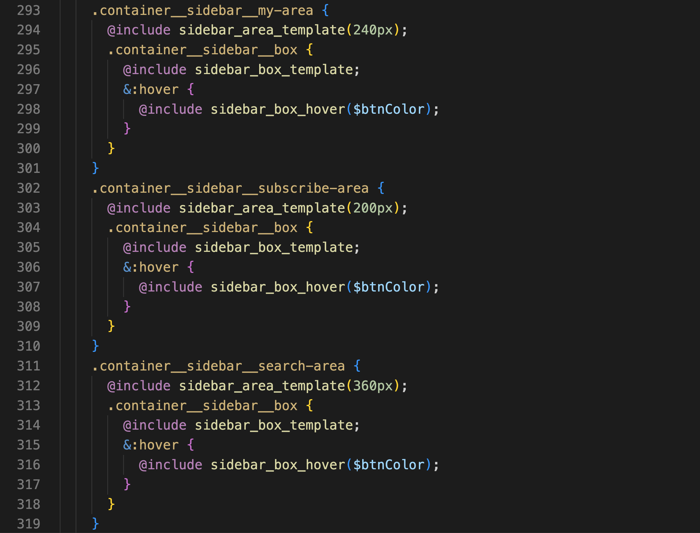 SCSS를 사용하며 또 좋았던 기능 중 하나는 재활용(Mixins) 기능이다. 재사용할 CSS 스타일을 @mixin 키워드로 선언하고, @include 키워드를 통해 사용할 수 있는 아주 편리한 기능이다.