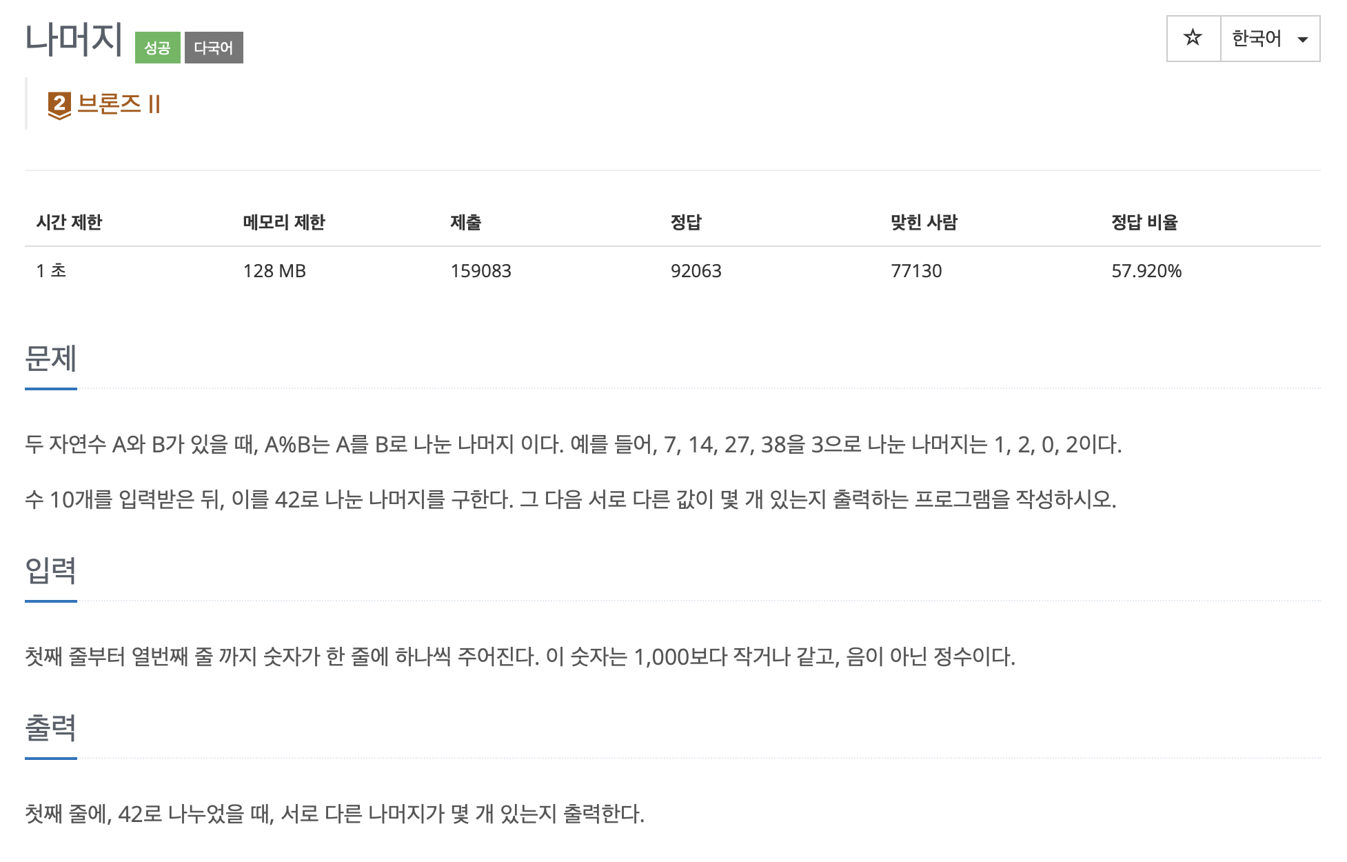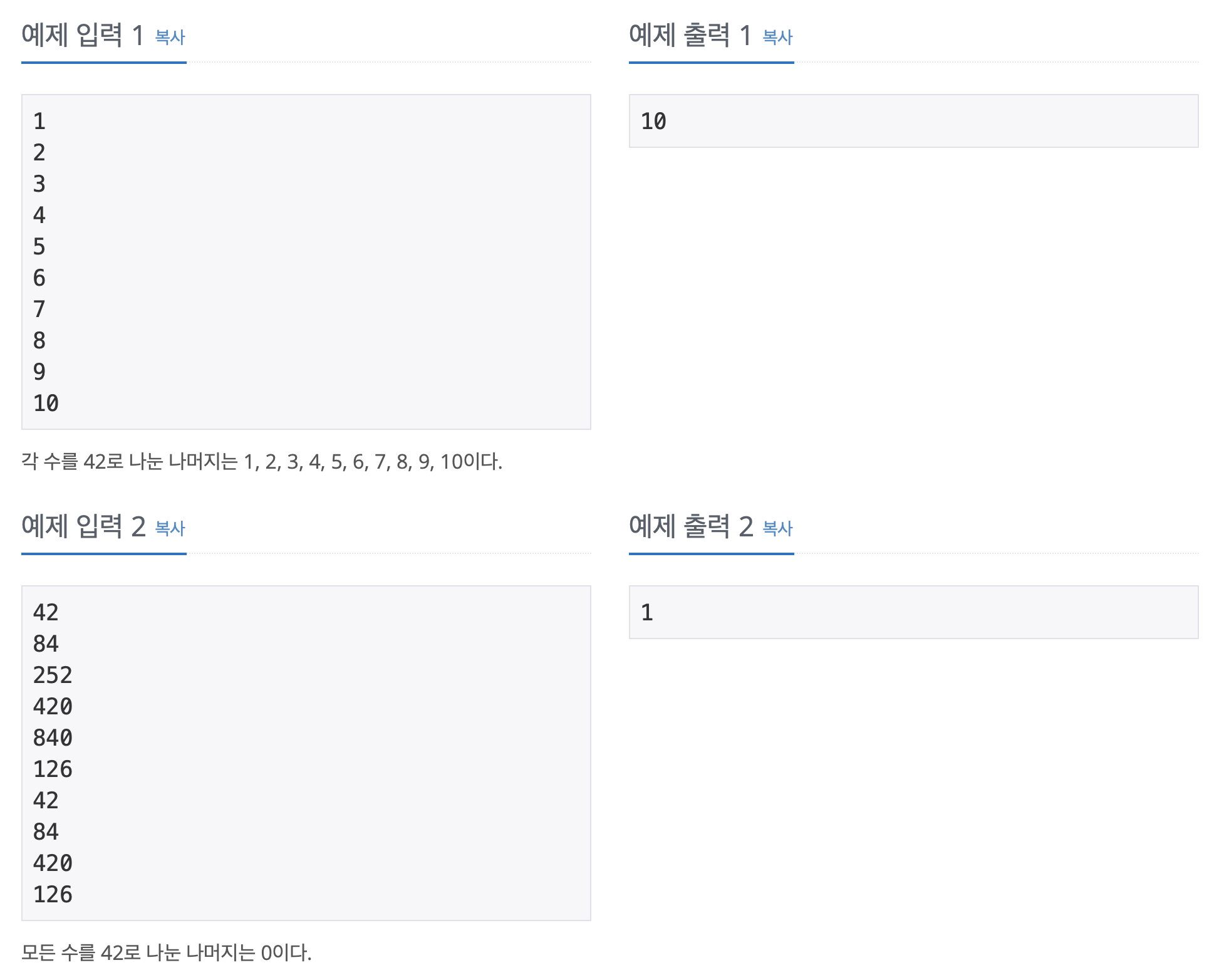 - num_list.append(int(input())%42) : 입력 값을 42로 나눈 나머지를 num_list 에 저장한다.