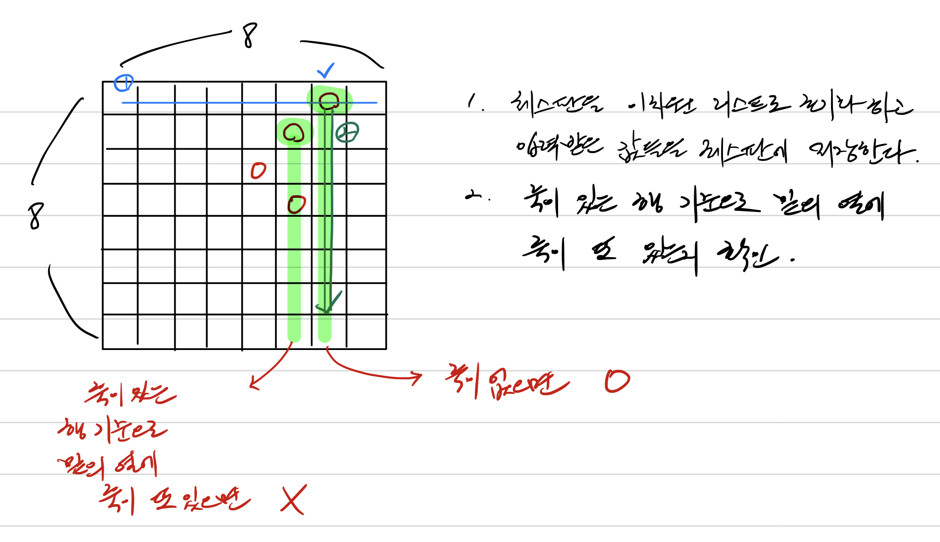 - 어떠한 행에 룩이 있다면, 룩의 위치를 기준으로 밑의 열을 확인한다. 만약 룩이 있다면, 룩이 있을 때 마다 임시로 초기화해둔 temp_ok 값을 1만큼 증가시킨다. 8열까지 확인 후, temp_ok에 1이 저장되어 있다면, 그 행에는 룩이 현재 위치 밖에 없는 것이므로, ok를 1 증가시킨다.