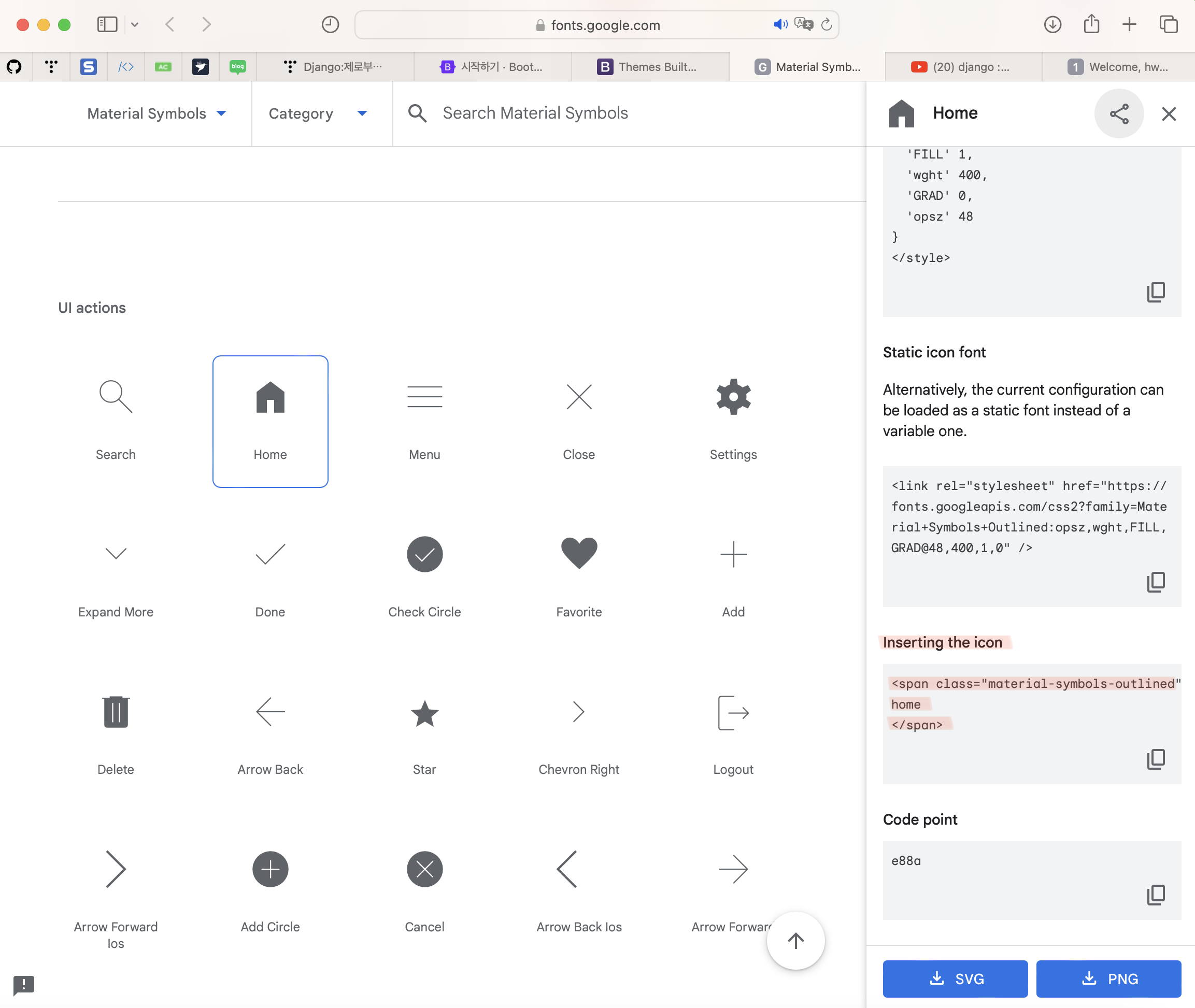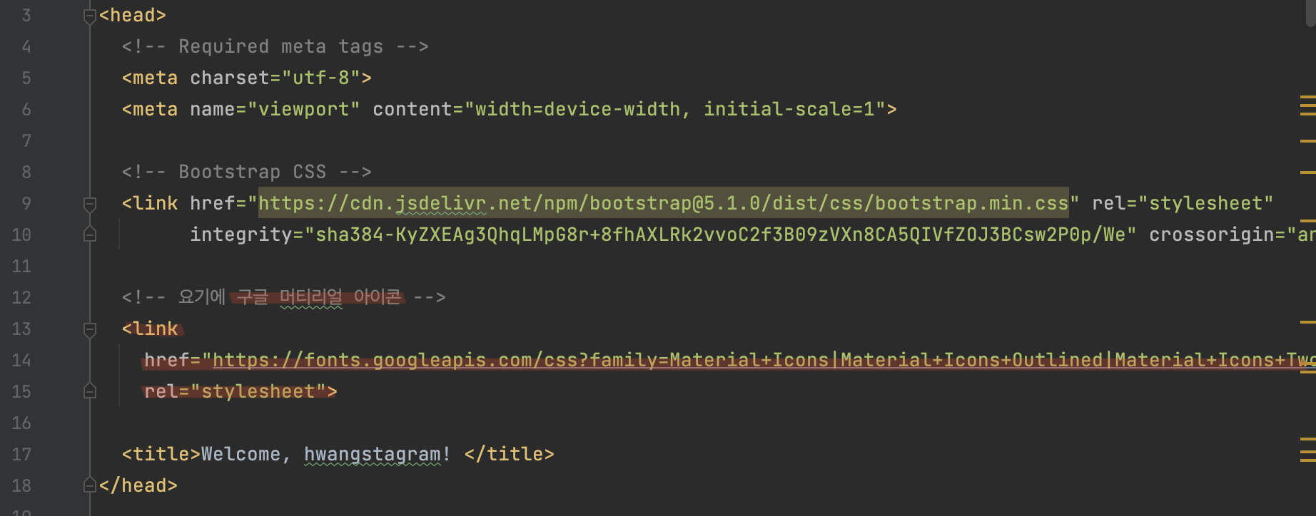 ํ์ง๋ง ๊ทธ ์ ์, ์ฐ๋ฆฌ๊ฐ ๋ถํธ์คํธ๋ฉ์ ์ฐ๊ธฐ ์ํด ์คํํฐ ํ ํ๋ฆฟ์ ๋ณต์ฌํด์ค ๊ฒ์ฒ๋ผ ๋จธํฐ๋ฆฌ์ผ ์์ด์ฝ ์ญ์ css์ js๋ฅผ ์ฌ์ฉํ ์ ์๋๋ก url์ ์ ์ด์ฃผ์ด์ผ ํ๋ค. <head> ๋ถ๋ถ์ ๊ตฌ๊ธ ๋จธํฐ๋ฆฌ์ผ ์์ด์ฝ ์ฌ์ฉ์ ์ํ url์ ์ ์ด์ฃผ๋ฉด ๋๋ค.