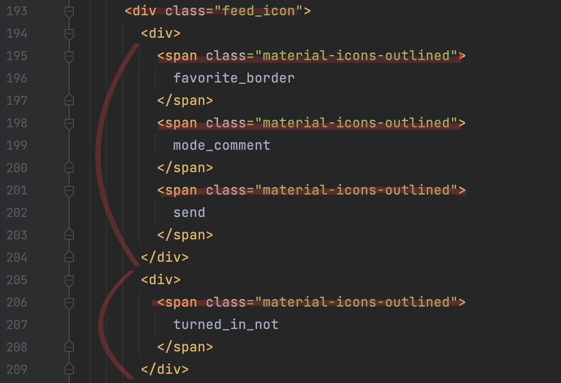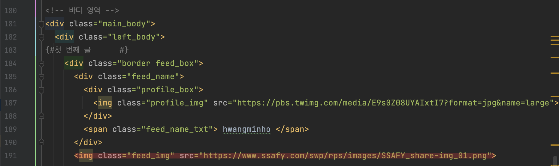 ์ด์ฒ๋ผ, css๋ ์๋จ์ ์ ์ํด๋๊ณ ์ฌ๋ฌ ํ๊ทธ์์ class๋ฅผ ํ์ฉํ์ฌ ์ถ๊ฐํ ์ ์๋ค. ์ฐธ๊ณ ๋ก <div class = "border feed_box"> ์์ border๋ ํ ๋๋ฆฌ๋ฅผ ๋ง๋๋ css์ด๋ค. ์ฌ๋ฌ๊ฐ์ ํผ๋๋ฐ์ค๋ฅผ ํ ๋๋ฆฌ๋ฅผ ํตํด ๊ตฌ๋ถํ๊ธฐ ์ํด border๋ฅผ ์ฃผ์๋ค.
