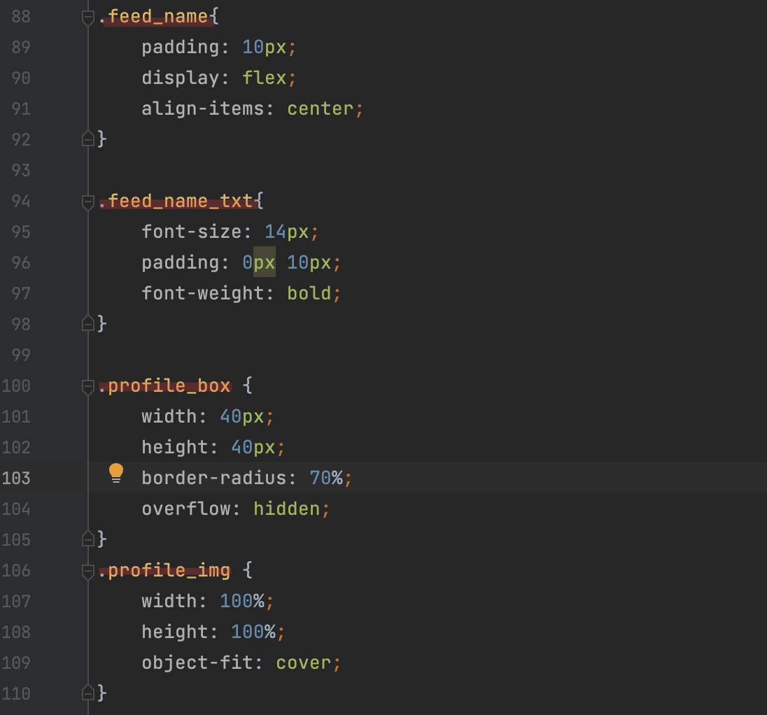 - feed_name : ํ๋กํ ์ด๋ฆ์ ํด๋นํ๋ ์์ฑ์ด๋ค. align-items๋ฅผ center๋ก ์ค์, ํ๋กํ ์ด๋ฏธ์ง ๊ธฐ์ค์ผ๋ก ์ ๊ฐ์ด๋ฐ์ ์ด๋ฆ์ด ์์นํ๋๋ก ํ๋ค.