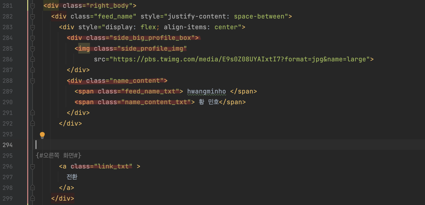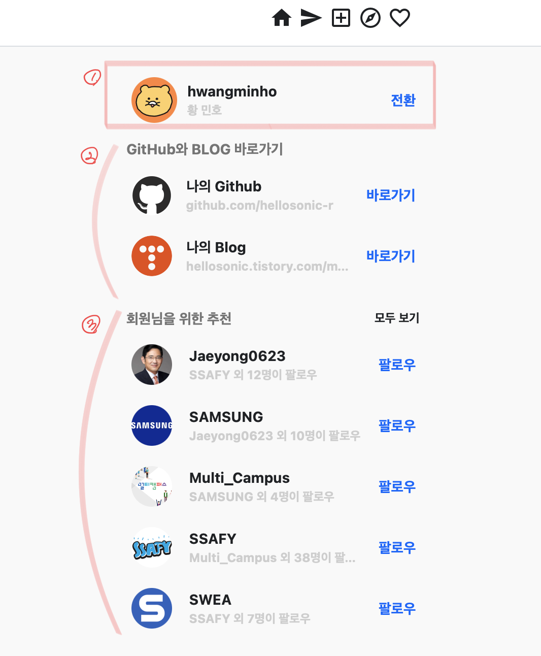 ์ด์ ์ผ์ชฝ ํ๋ฉด์ ํ์ ์ด๋์ ๋ ์ก์์ผ๋ ์ค๋ฅธ์ชฝ ํ๋ฉด์ ๋ง๋ค์ด ๋ณผ ์ฐจ๋ก์ด๋ค. ์ธ์คํ๊ทธ๋จ์ ์ค๋ฅธ์ชฝ ํ๋ฉด์ ๋ณด๋ฉด ์ ์ผ ์๋จ์ ๋ด ํ๋กํ ๋ฐ์ค๊ฐ ์๊ณ , ํ๋จ์ "ํ์๋์ ์ํ ์ถ์ฒ" ๋ฐ์ค๊ฐ ์๋ค. ํ์ง๋ง ๋๋ ์ฝ๊ฐ ์์ฉํ์ฌ ๋์ ๊นํ๋ธ ์ฃผ์์ ๋ธ๋ก๊ทธ ์ฃผ์์ ์ ์ ๊ฐ๋ฅํ๋๋ก ๋ง๋ค์ด ๋ณผ ์๊ฐ์ด๋ค.