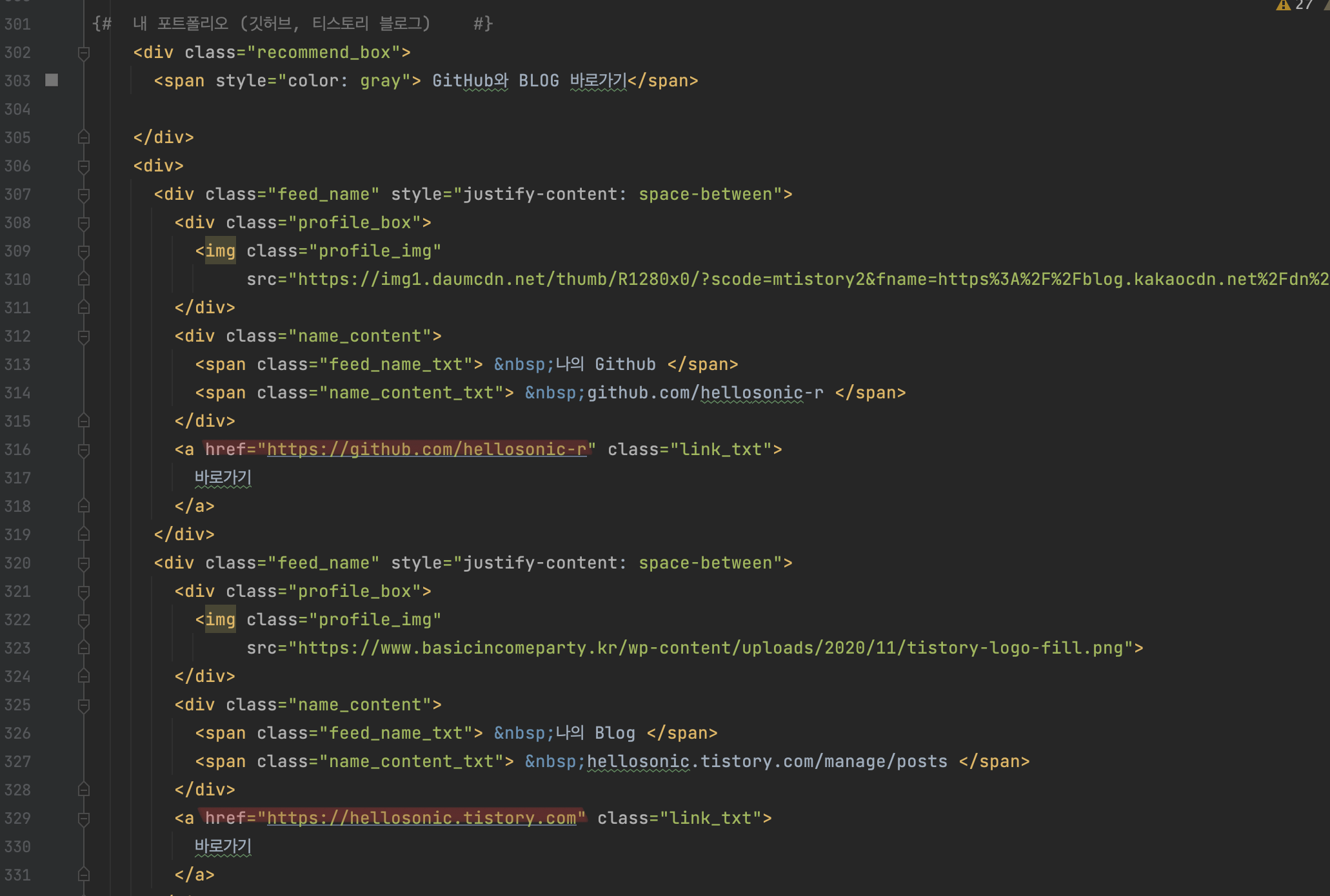 ๋์ ๊นํ๋ธ์ ๋ธ๋ก๊ทธ์ ์ ์ ๊ฐ๋ฅํ๋๋ก ๋งํฌ๋ฅผ ๊ฑธ๊ณ ์ถ์๋ค. ํ๋กํ ์ฌ์ง๊ณผ ์ด๋ฆ์ ๋ง๋๋ ๊ฒ์ ์ด์ ๊ณผ ๋์ผํ๋ ๋งํฌ๋ฅผ ๊ฑฐ๋ ๋ฐ์ ํ ๊ฐ์ง ๊ณผ์ ์ด ๋ ํ์ํ๋ค.