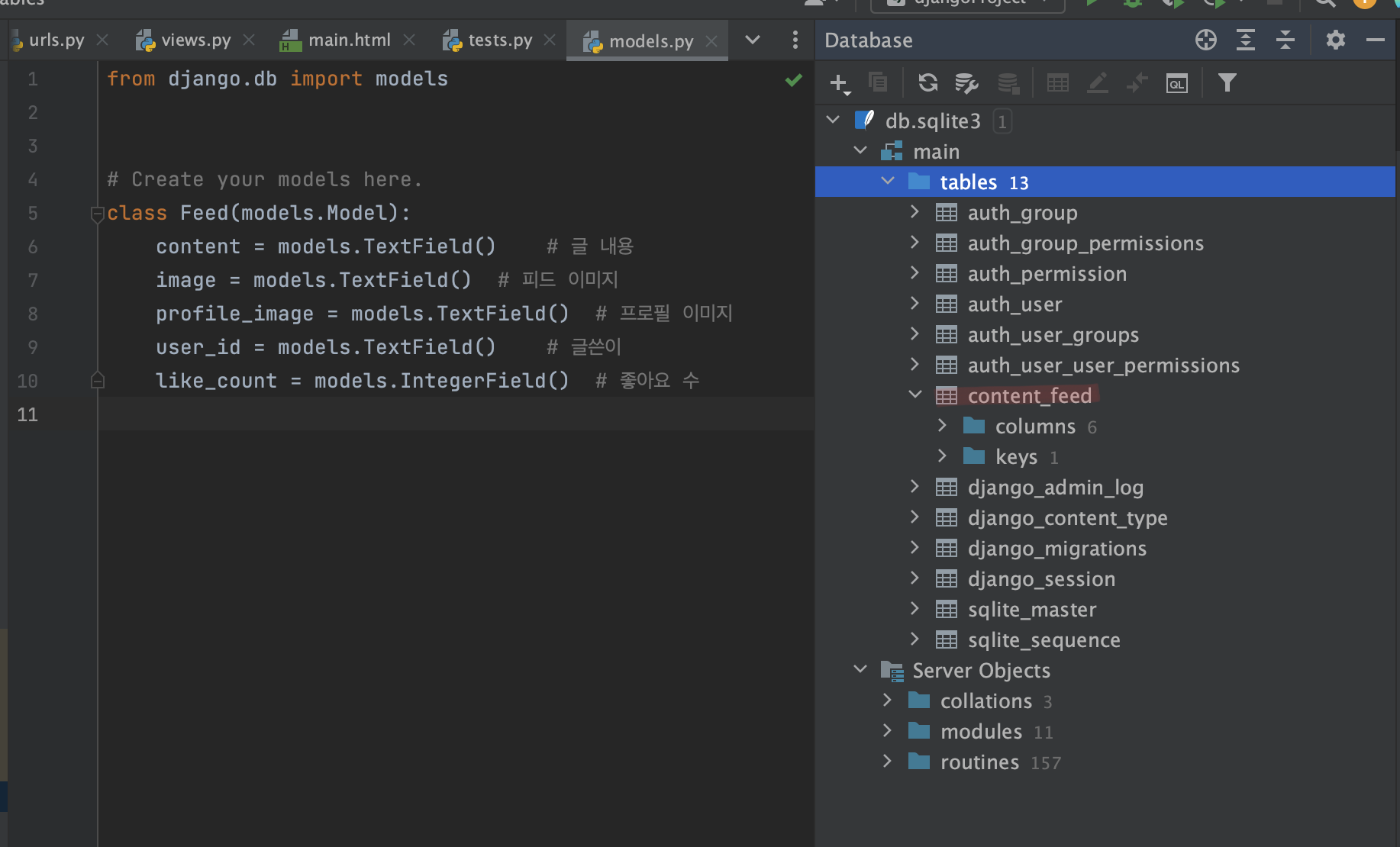 장고에서 DB를 사용하려면 MVT패턴 중 Model을 구성하면 된다. 먼저, 피드에 해당하는 모델을 만들었다.