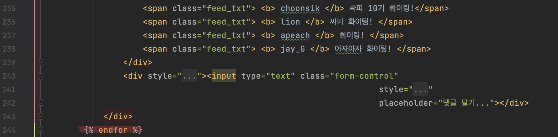 또한 html에서 python 코드를 사용하기 위해서는 {% %}를 사용하면 된다. DB에 작성한 데이터의 개수만큼 반복을 수행하기 위해 for문을 사용하여 데이터(feed_list) 안에 feed를 하나씩 꺼냈고, for문이 끝나면 항상 {% endfor %}를 해줘야 한다.