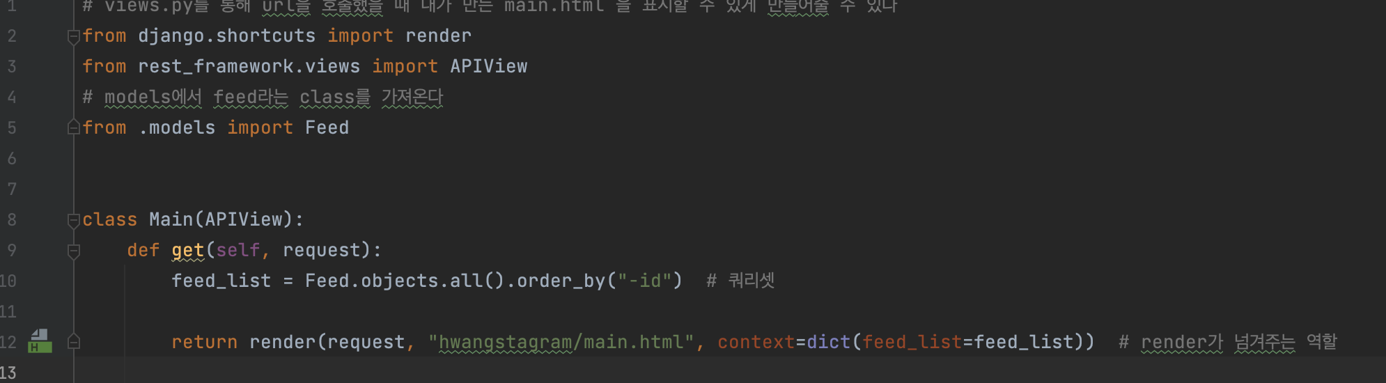 위의 소스에서 "feed_list = Feed.objects.all()" 은 모델을 활용하는 코드이다. 즉, 모델(models.py)에서 작성한 클래스 Feed 의 모든 내용을 불러오는 코드이다. "render(request, "hwangstagram/main.html", context=dict(feed_list=feed_list))" 는 "render에 우리가 이동하고 싶은 html(main.html)과 데이터(context=~)를 각각 넣으면 데이터가 이동한다."는 뜻이다.