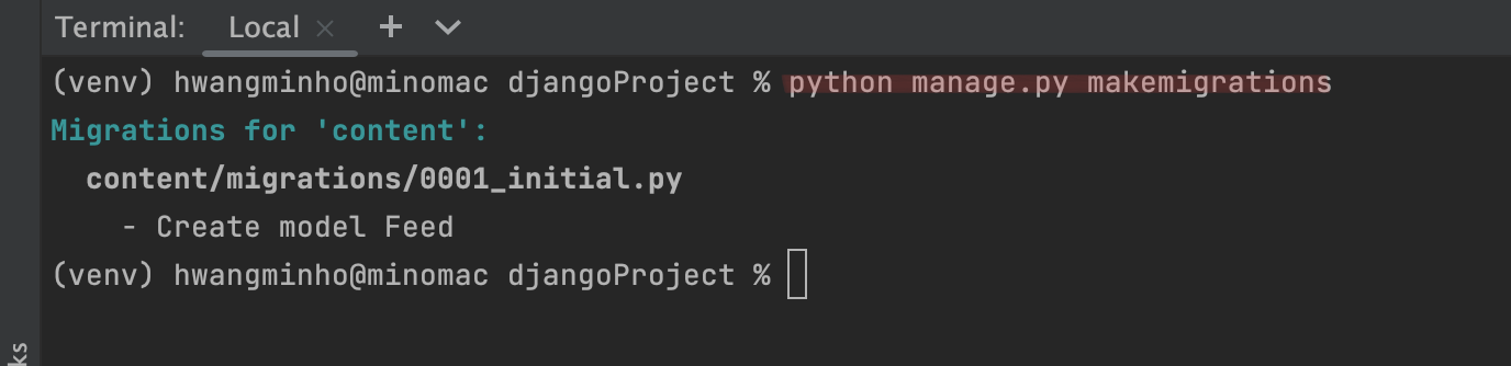 이제 만든 모델을 마이그레이션 해야하는데 터미널 명령어 "python manage.py makemigrations" 를 통해 마이그레이션 파일을 생성한다.