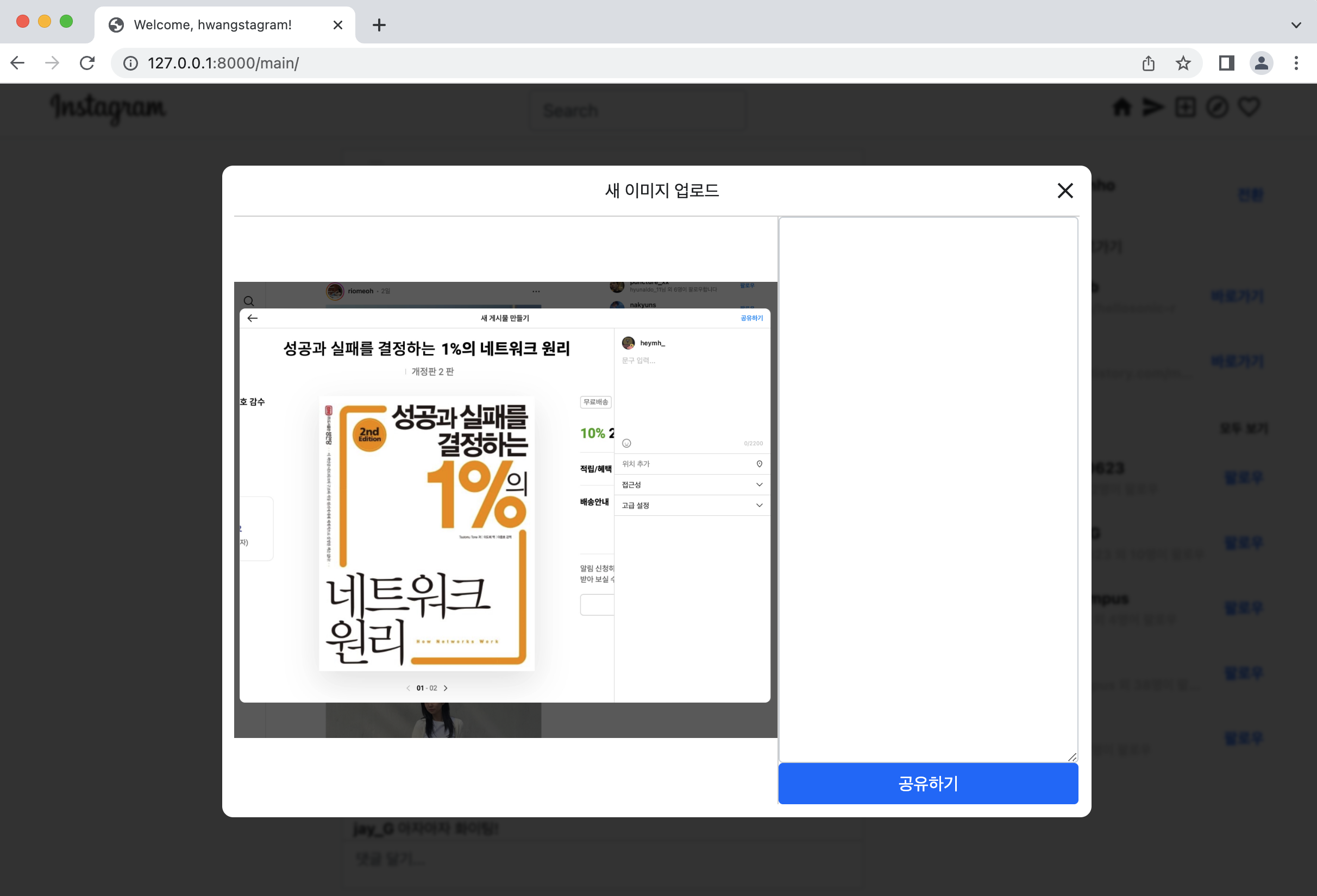 ๋ ๋ฒ์งธ ๋ชจ๋ฌ์ฐฝ์ ์์ฑํ๋ ์์ค๋ ์๋์ ๊ฐ๋ค. ์ฒซ ๋ฒ์งธ ๋ชจ๋ฌ์ฐฝ์ ์์ค์ ํฌ๊ฒ ๋ค๋ฅด์ง๋ ์์ง๋ง, ๋ชจ๋ฌ์ฐฝ์ ์ข์ธก์๋ ์ด๋ฏธ์ง๊ฐ ๋ค์ด๊ฐ์ผ ํ๊ณ , ์ฐ์ธก์๋ "ํ ์คํธ ์ ๋ ฅ ํผ"๊ณผ "๊ณต์ ํ๊ธฐ ๋ฒํผ"์ด ๋ค์ด๊ฐ์ผ ํ๋ค. ์ด๋ฏธ์ง๊ฐ ๋ค์ด๊ฐ์ผ ํ๋ "img_upload_space" <div>์ width๋ฅผ ์ค์ฌ์ฃผ๊ณ , ํ์ <div>ํ๊ทธ์ style ์์ฑ์ "border-left" ์์ฑ๊ฐ์ ํตํด ์ธ๋ก ํ ๋๋ฆฌ๋ฅผ ๋ง๋ค์๋ค. ๊ทธ๋ฆฌ๊ณ <div>๋ฅผ ํตํด ๋ถํธ์คํธ๋ฉ์์ ์ฐพ์ ํ ์คํธ ์ ๋ ฅ ํผ ์์ค๋ฅผ ์ถ๊ฐํด์ฃผ๊ณ , ํ๋จ์๋ ๊ณต์ ํ๊ธฐ ๋ฒํผ์ ์ถ๊ฐํด์ฃผ์๋ค.