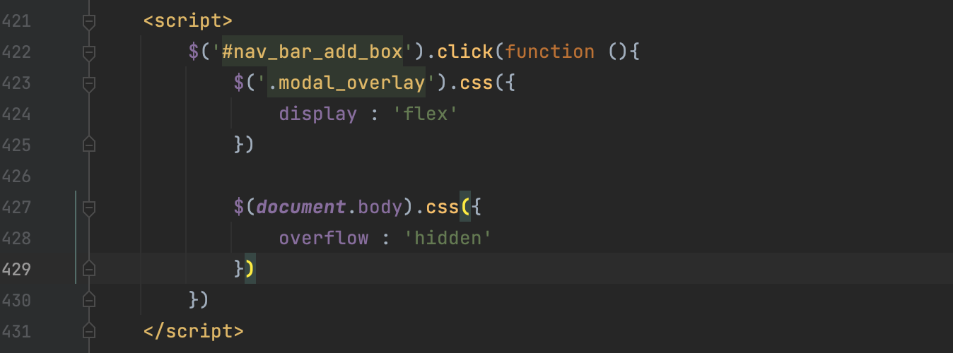 "nav_bar_add_box"๋ฅผ ๋๋ฅด๊ฒ ๋๋ฉด "modal_overlay"์ css ์์ฑ๊ฐ "display"๊ฐ flex๋ก ๋ฐ๋๊ฒ ๋๊ณ , ๋์์ ๋ฐ๋ ๋ถ๋ถ์ ์คํฌ๋กค ํ์์ ๊ธฐ๋ฅ์ด ์ฌ๋ผ์ง๋๋ก ์์ฑํ๋ค.