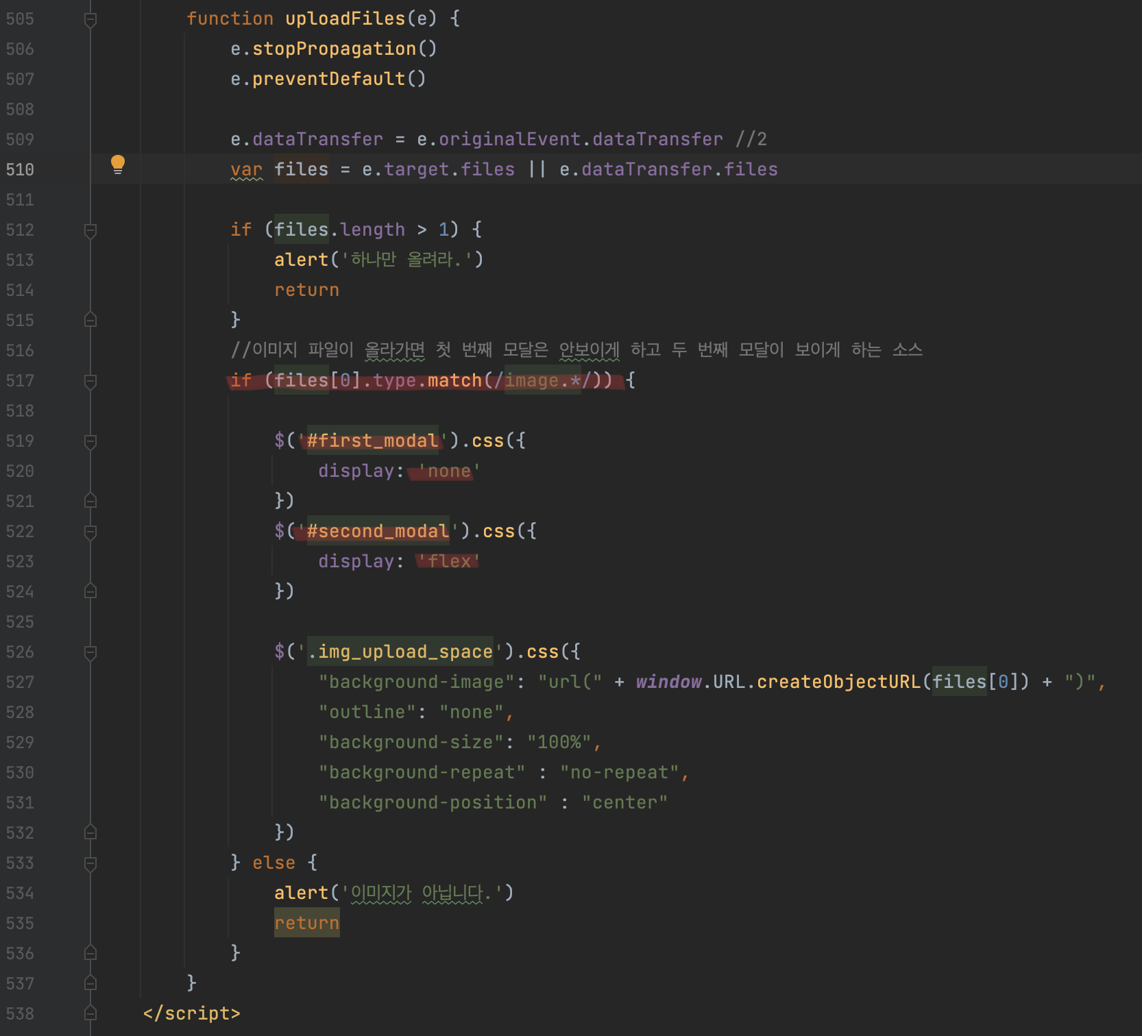 ๋ง์ฝ, ํ๋์ ํ์ผ์ ์ฌ๋ ธ์ ๋, ๊ทธ ํ์ผ์ด ์ด๋ฏธ์ง์ด๋ผ๋ฉด, ์ฒซ ๋ฒ์งธ ๋ชจ๋ฌ์ฐฝ์ "display: none"์ด ๋๊ณ , ๋ ๋ฒ์งธ ๋ชจ๋ฌ์ฐฝ์ "display: flex"๊ฐ ๋๋ค.