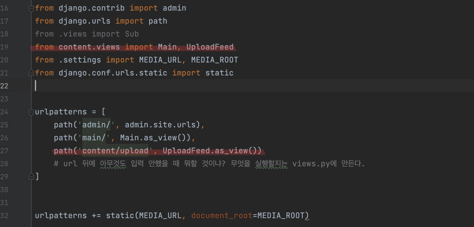 views.py에 <ajax 통신을 통해 서버에서 데이터를 받는 소스>를 만들어주었다면, views.py 안에 UploadFeed 클래스가 urls.py랑 맵핑이 되어야 한다. 아래와 같이 urls.py 소스를 작성해줌으로써 content.views에 있는 UploadFeed가 실행되도록 작성한다.