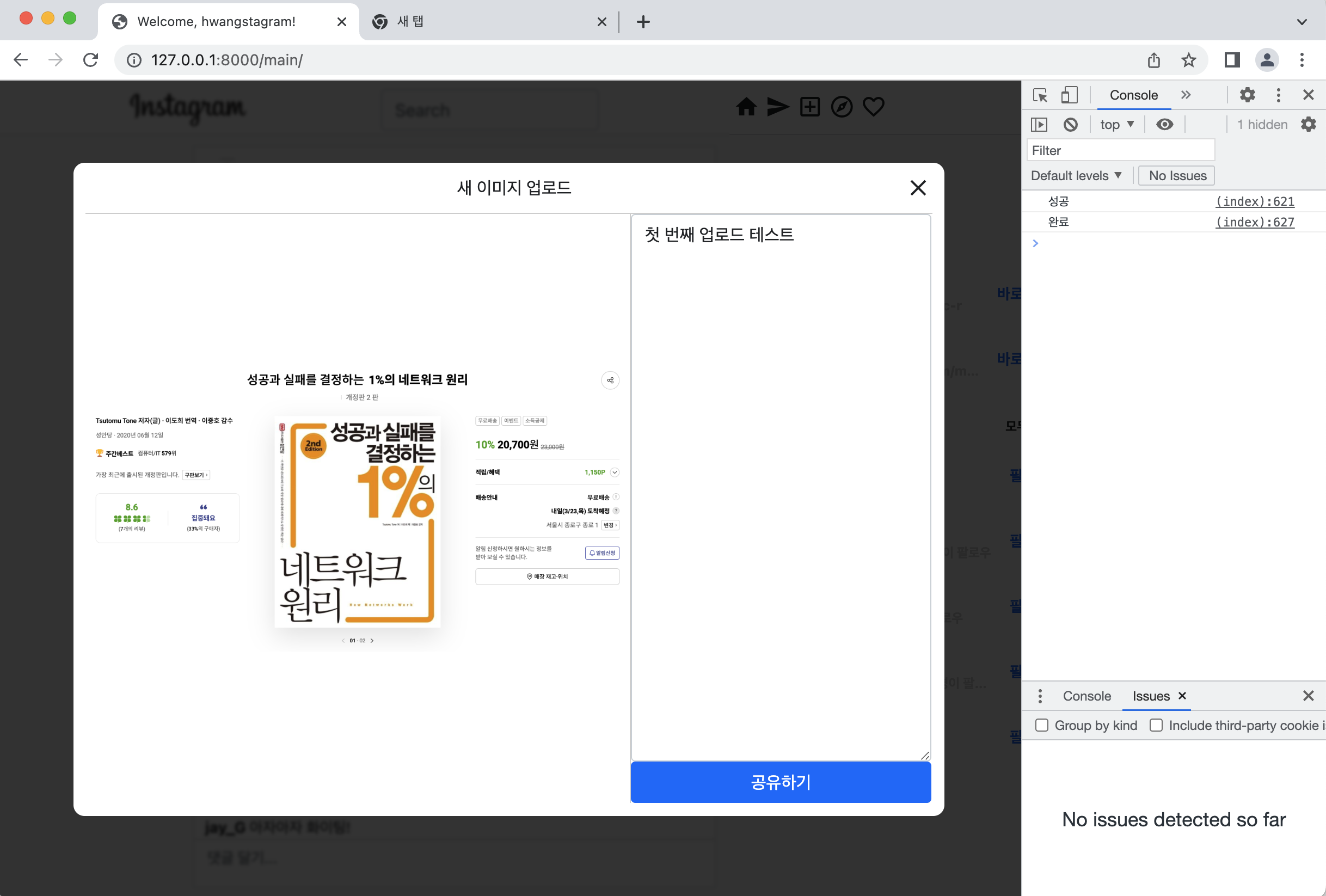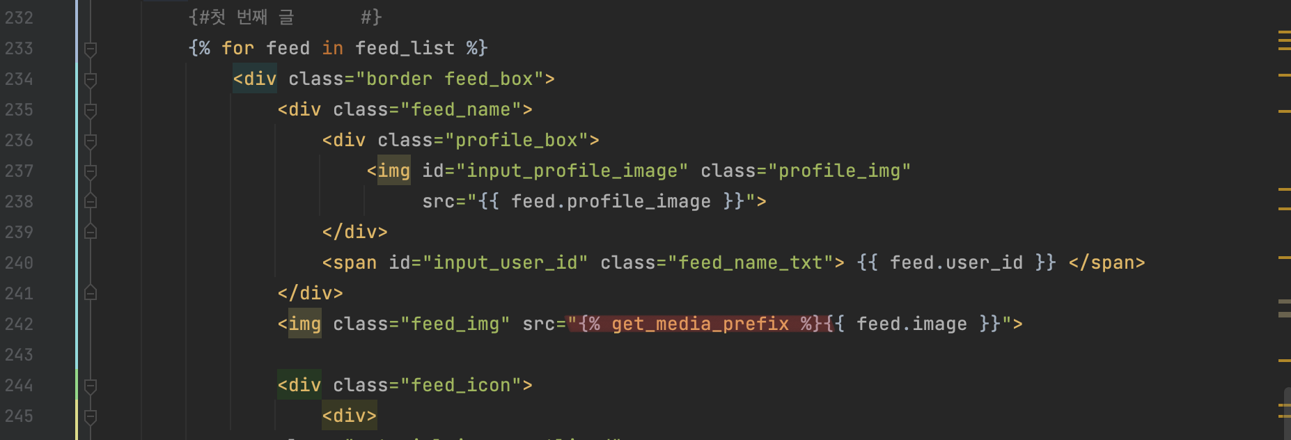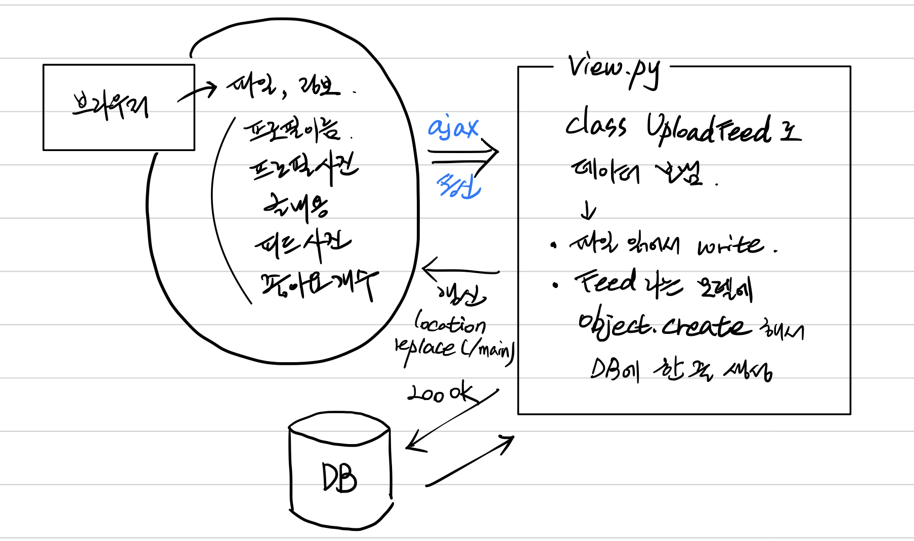 이제 피드를 생성해보자. 이미지를 드래그하여 드랍하고, 피드 내용을 적고 공유하기 버튼을 누르게 되면 "프로필 이미지, 프로필 이름, 피드 이미지, 피드 내용, 좋아요 개수" 데이터가 ajax를 통해 views.py로 전달된다. views.py에서 받은 데이터 중 파일에 해당하는 것들은 "media/"경로에 새롭게 생성된 고유 ID로 저장되게 되고 같은 이름으로 DB image 필드에 저장된다. 그 후, main.html이 feed를 읽을 때 DB의 각 필드에 저장한 값들을 호출하게 되고, 파일의 경우 media경로를 합쳐서 ~/media/{파일 이름} 으로 호출한다. 정상적으로 이미지가 띄워지기 위해서는 {%get_media_prefix %}를 붙여줌으로써 이미지 주소가 정확하게 표현되어야 한다.