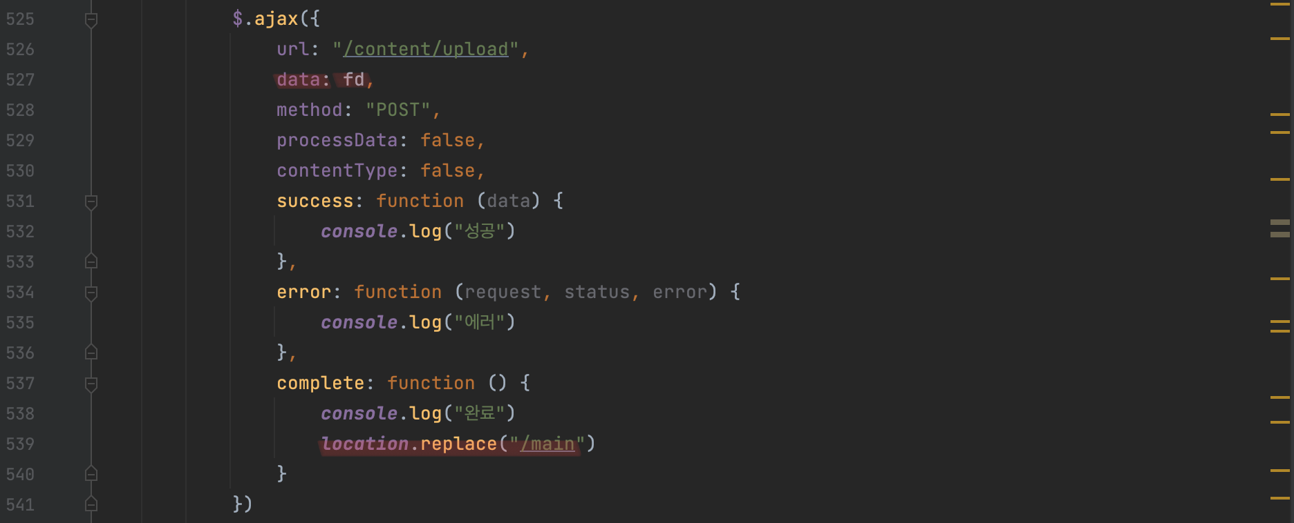 ajax에 success, error, complete function이 있는데 각각 성공, 실패, 완료 후 실행되는 callback 함수이다. (callback 함수 : 특정 조건에서 호출되는 함수) ajax api 요청이 성공하면 자동으로 success 안의 코드가 실행되며, 에러일 경우에는 error가 실행되고 complete는 성공이든 실패든 요청이 끝나면 무조건 실행된다. 또한 complete가 실행될 경우 작성된 "location.replace("/main")"로 인해 웹사이트 main 페이지가 띄워지게 된다.
