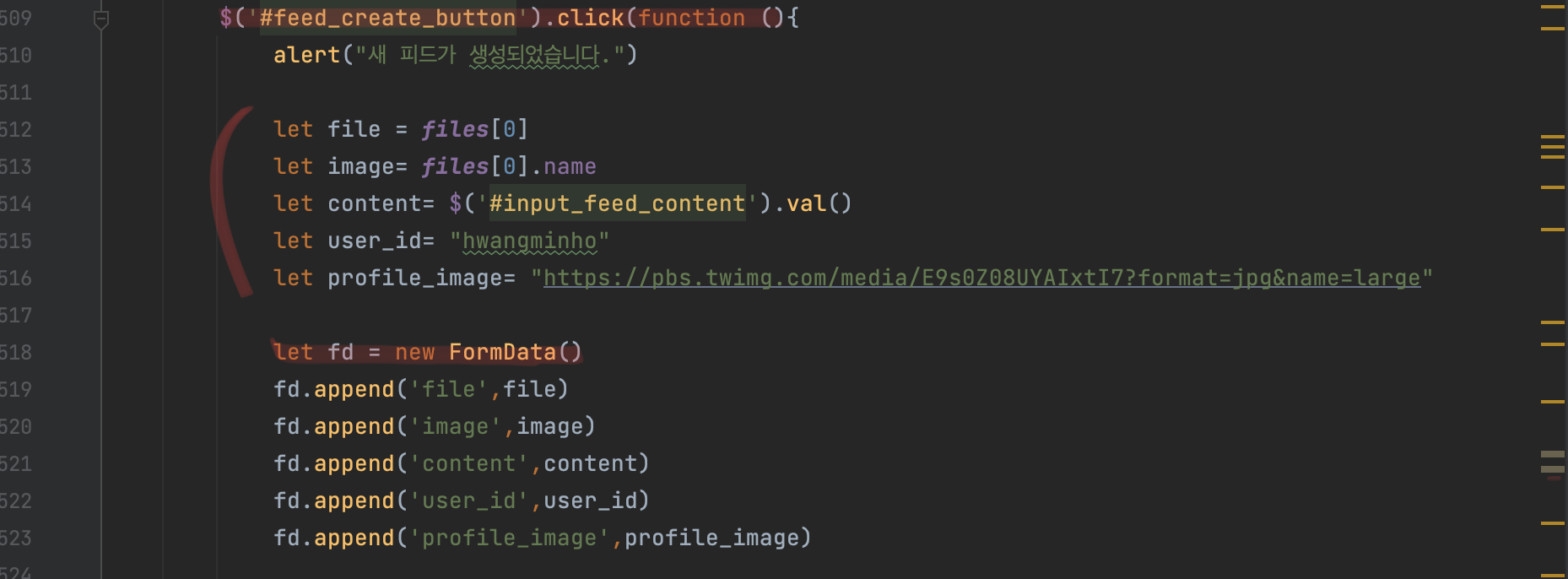 공유하기 버튼 즉, id= "feed_create_button"을 클릭하면 웹페이지에 입력된 데이터를 긁어 모으게 된다. image, content, profile_image, user_id, file을 가져와서 데이터가 비어있는지 채워져 있는지 체크를 한다. 이후 긁어 모은 파일을 전송하기 위해서 formdata를 사용해야하기 때문에 만들어준다. (파일이 아닌 일반적인 데이터 같은 경우는 json 형태로 넘기는 것이 보통이다.(rest표준))