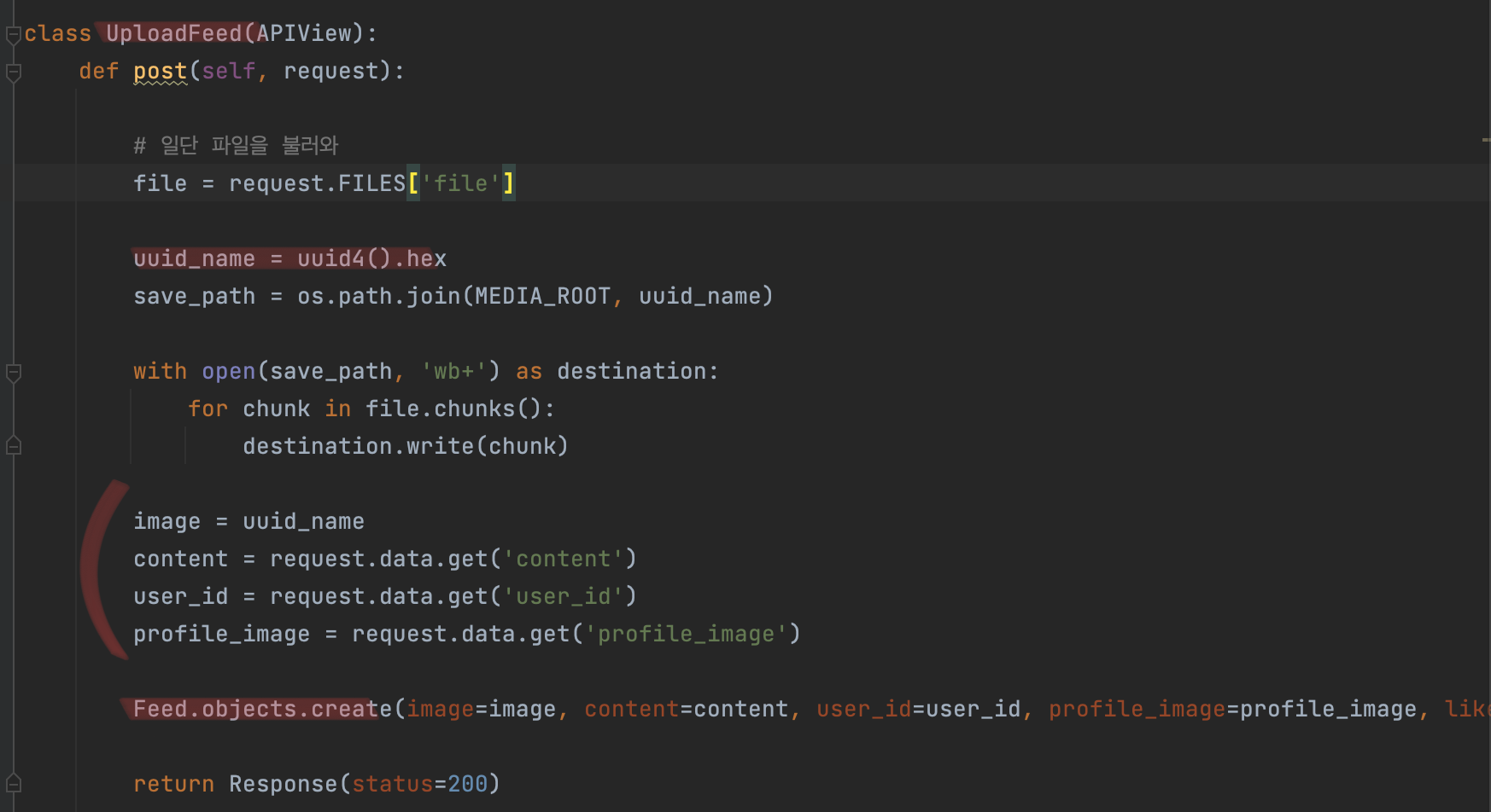 views.py에 UploadFeed라는 class를 생성하고, 이후 urls.py에 ajax에서 만든 url 경로를 맵핑해준다. 이제 views.py에 데이터를 받는 소스들을 작성해주어야 하는데, 이때 이미지는 파일 서버에 저장되게 해주어야 한다. 하지만, 파일 서버가 없다. 그럴 때는 장고에서 제공하는 "media 폴더" 기능을 활용하면 된다.