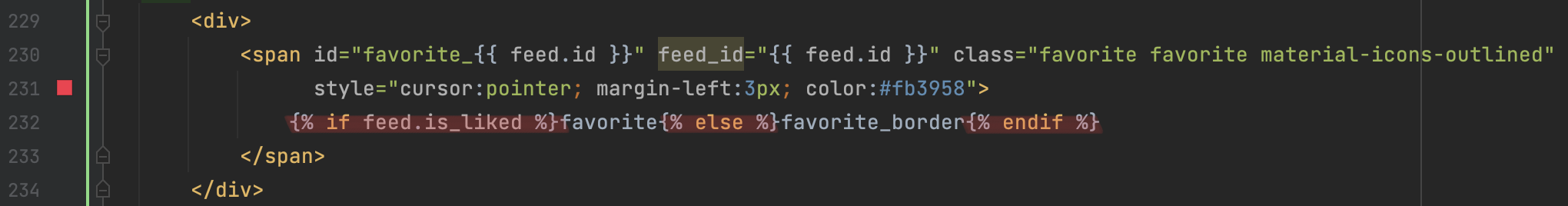 그 다음, 좋아요를 눌렀을 때 하트가 채워지도록 html을 수정한다. feed(feed_list의 for문 내 변수)의 is_liked가 True(좋아요 눌린 상태)이면 꽉찬 하트, 그렇지 않다면 빈 하트가 화면에 표시되도록 하는 소스이다.