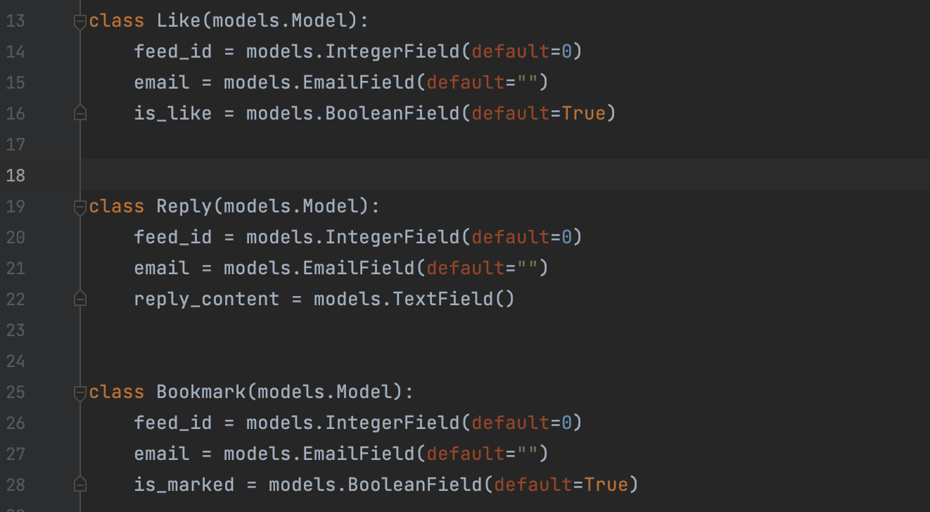피드를 구성하는 데에 필요한 새로운 모델들을 만든다. content/models.py에 만들면 된다. 좋아요/북마크를 누르거나 취소할 때 값을 각각 True, False로 주기 위해서 BooleanField를 사용했다.