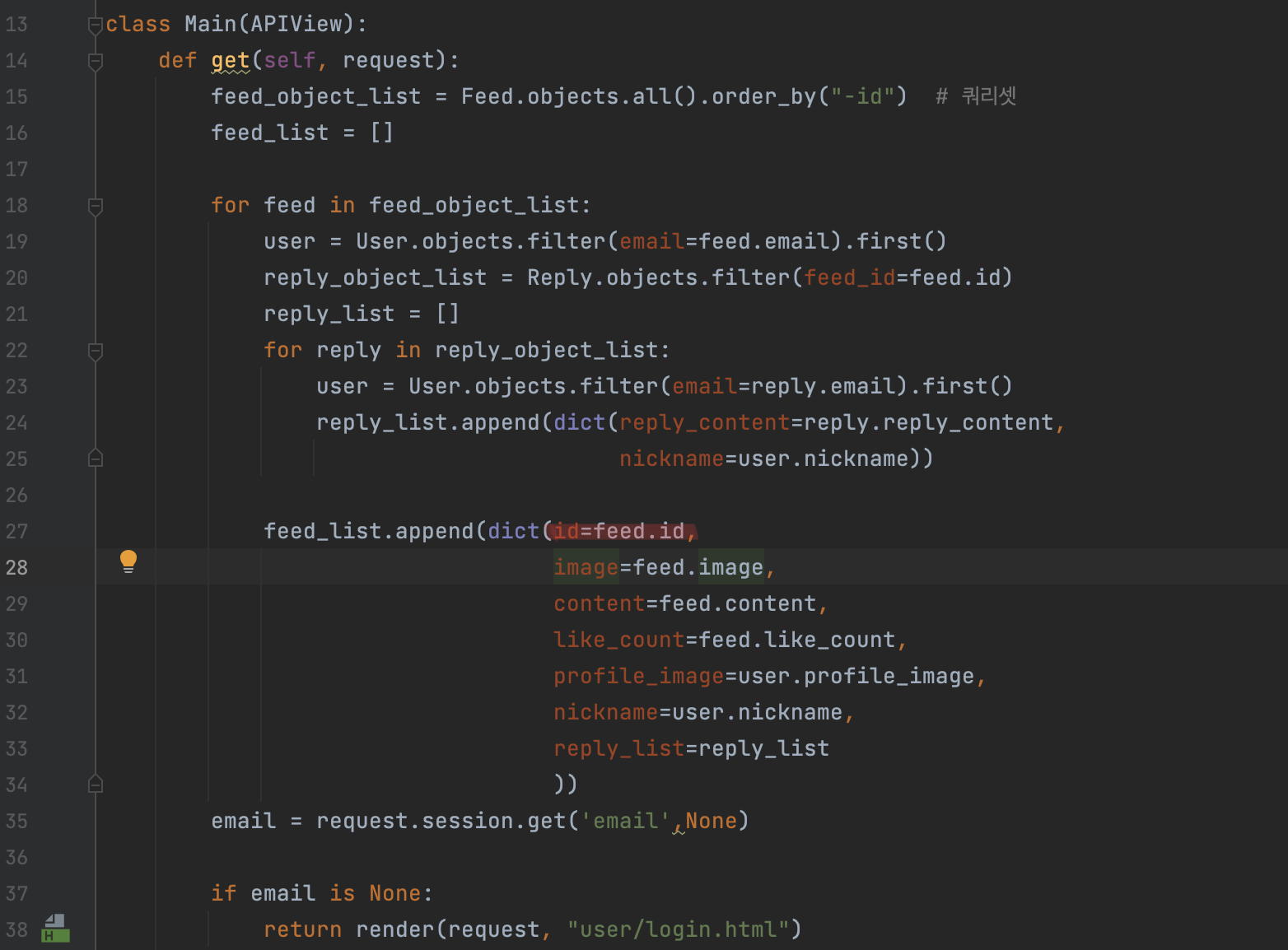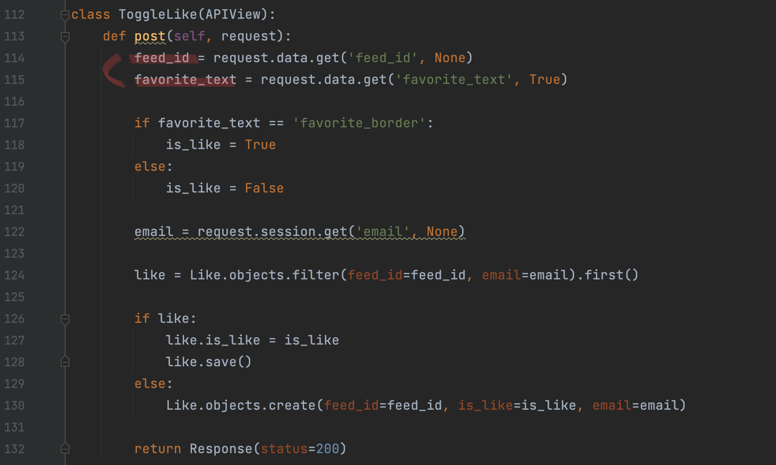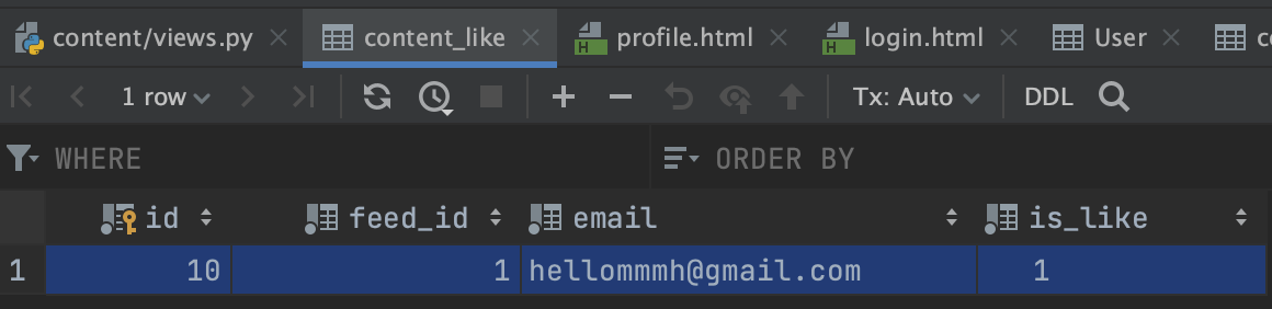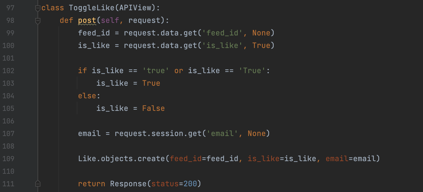 먼저, 다시 뷰로 돌아와 사용자(세션 정보에 들어있는 이메일)가 피드 아이디에 대해서 좋아요를 누른 것이 exists하다면 is_liked 값에 True가 들어갈 수 있도록 작성한다.