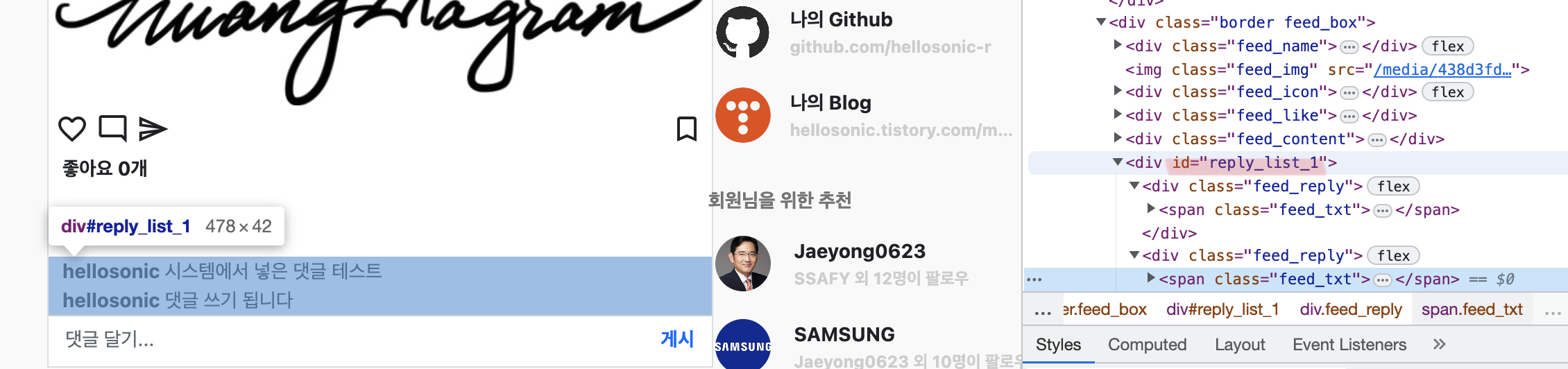먼저, 피드 댓글 조회 창 상위에 새로운 <div>를 만들고 id를 지정한다. 즉, 특정 피드에 해당하는 댓글들의 모임의 id를 지정하고, 댓글 추가 시 그 댓글들의 모임에 새로운 댓글을 추가시켜주면 되는 것이다.