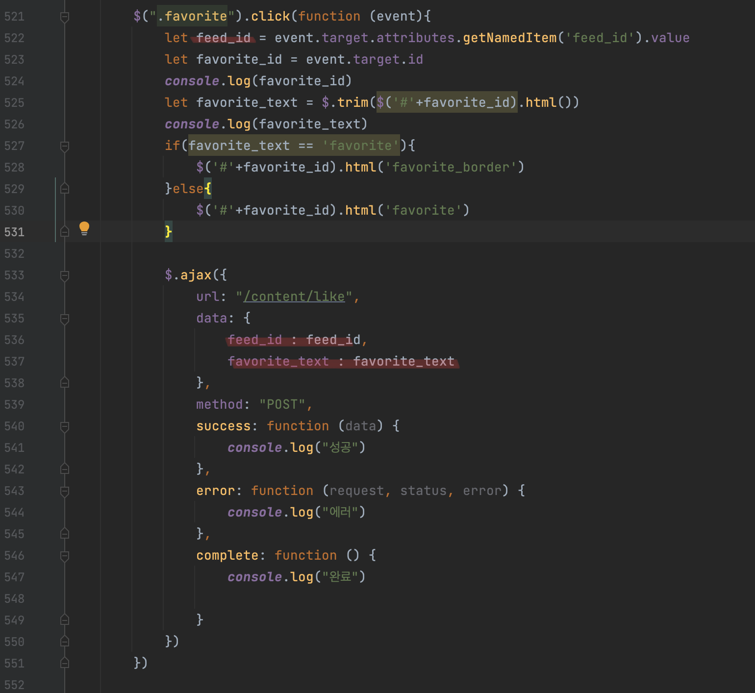 화면에서 바꾸는 것은 구현했으니 이제 좋아요를 눌렀을 때 ajax로 올려야 된다. 올릴 때 어떤 것을 올리면 되는지 아까 작성한 뷰에서 참고해보자. 좋아요 테이블에는 feed_id, is_like, email 세 개 필드가 필요한데 이것을 데이터로 받기 위해 ajax로 feed_id와 favorite_text를 올리면 된다.