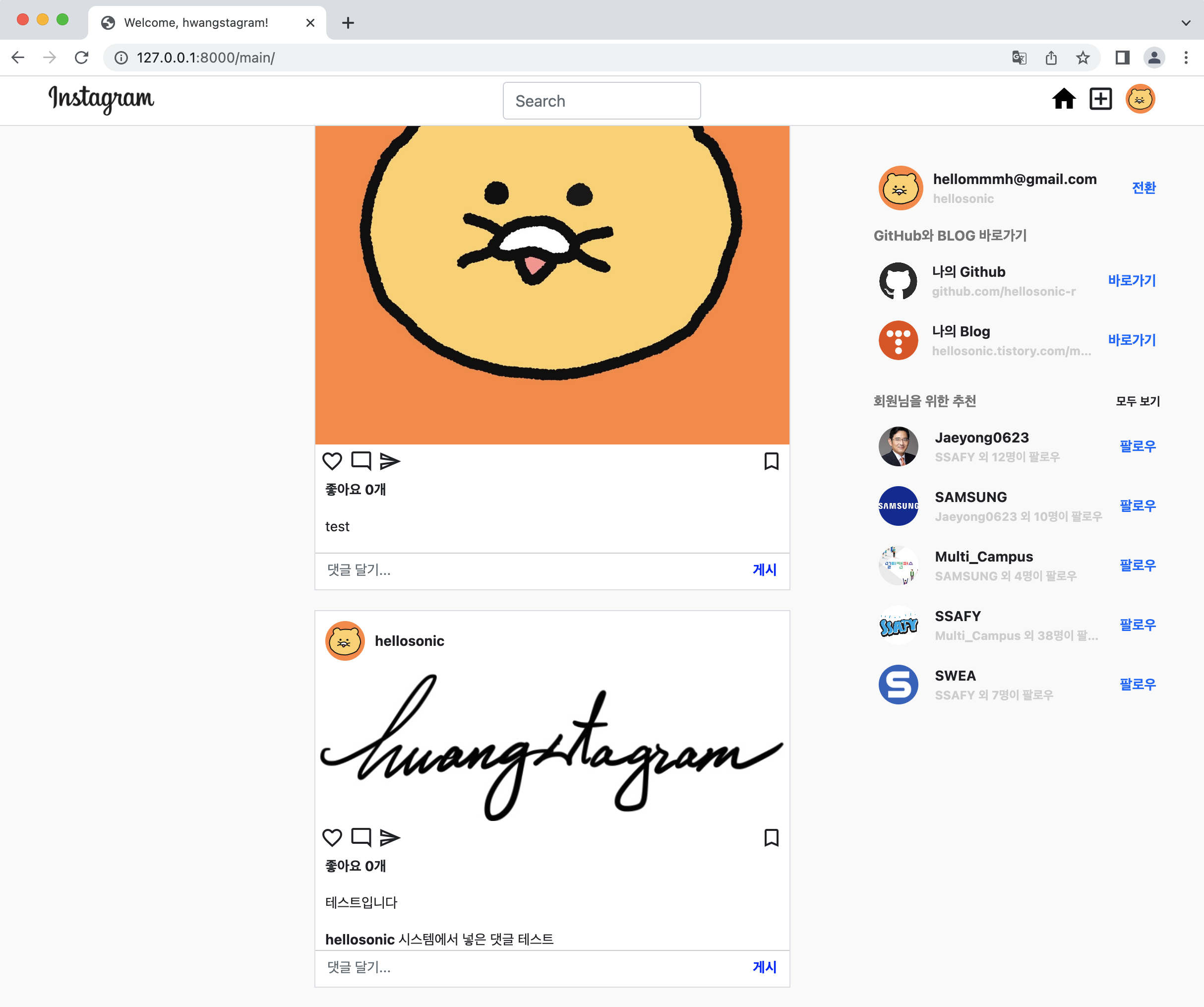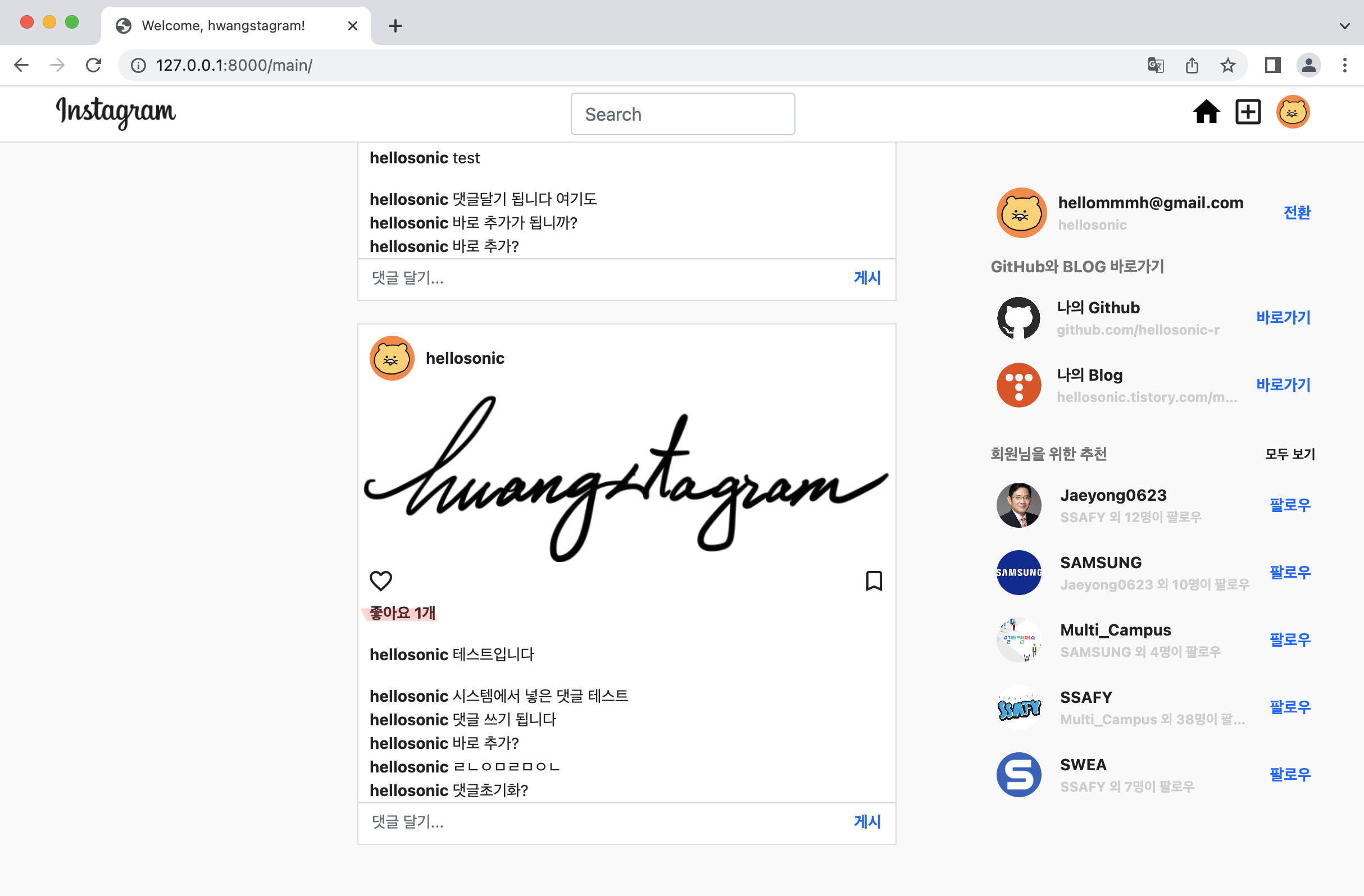 소스 작성이 완료되었다면, 브라우저로 돌아와 댓글을 작성해보자. "댓글 달기..." 입력창에 댓글을 입력하고 게시 버튼을 누르면 해당 피드에 댓글이 정상적으로 작성된다. 이 때, 위에서 작성한 ajax를 살펴보면 함수가 complete 되었을 때 location.replace("/main")으로 이동하게 되어있다. 그런데 만약, 전체 화면을 새로고침 해주지 않고 댓글만 업로드되도록 하고 싶다면 다시 ajax를 써주면 된다.