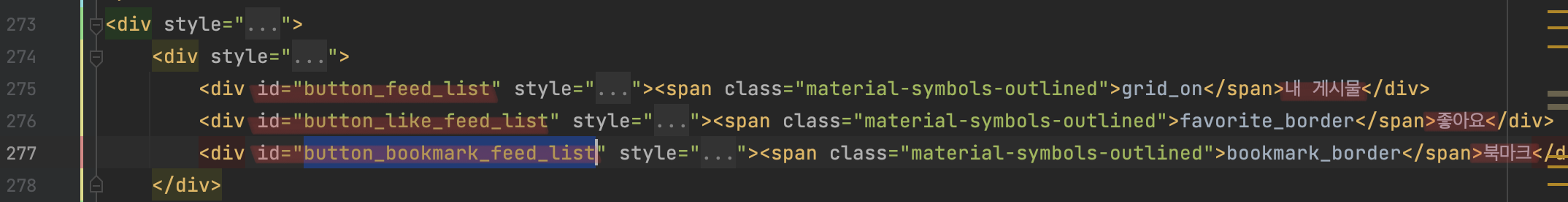 이제 각 버튼에 id를 지정하고, 내 게시물, 좋아요, 북마크 탭 클릭시 피드 리스트를 내려주는 소스의 최상위 div에도 id를 지정하여 제이쿼리를 통해 각 버튼을 클릭했을 때 어떤 항목을 보여주고(display: flex) 어떤 항목을 숨길지(display: none) 작성한다.