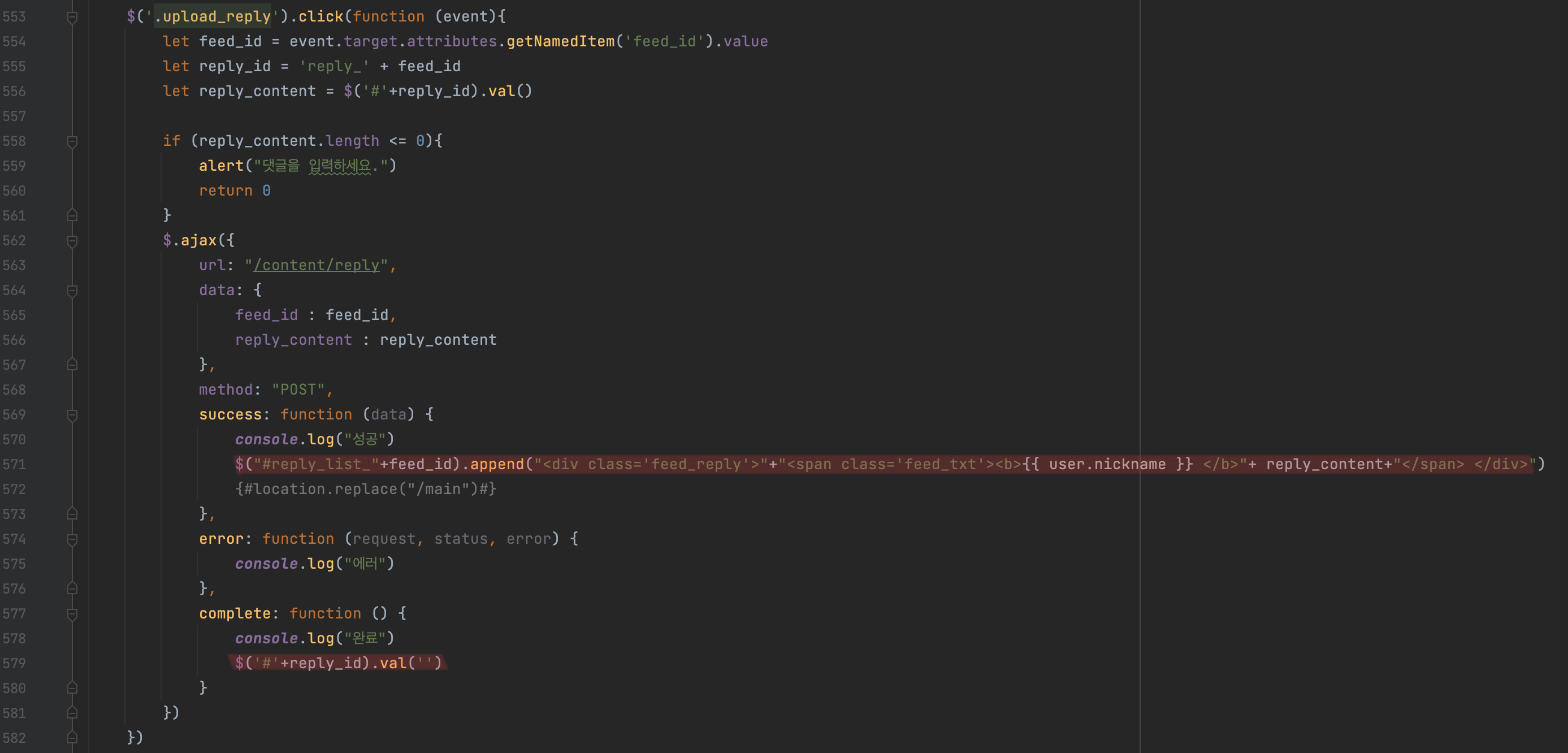 이제 제이쿼리를 사용하여 각 피드 id에 해당하는 부분에 <div> 생성하는 소스를 아래와 같이 작성하면 된다. 함수가 성공했을 경우 <div>가 생성이 되고, 함수가 완료되면 댓글 입력창이 초기화될 수 있도록 소스를 작성하였다.