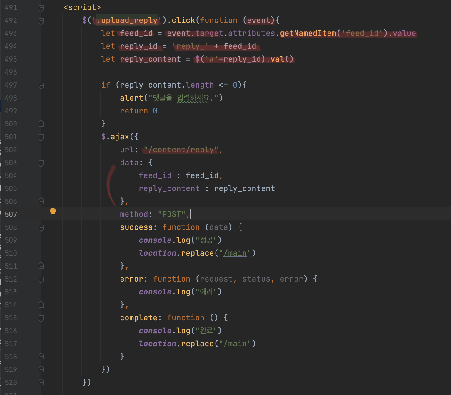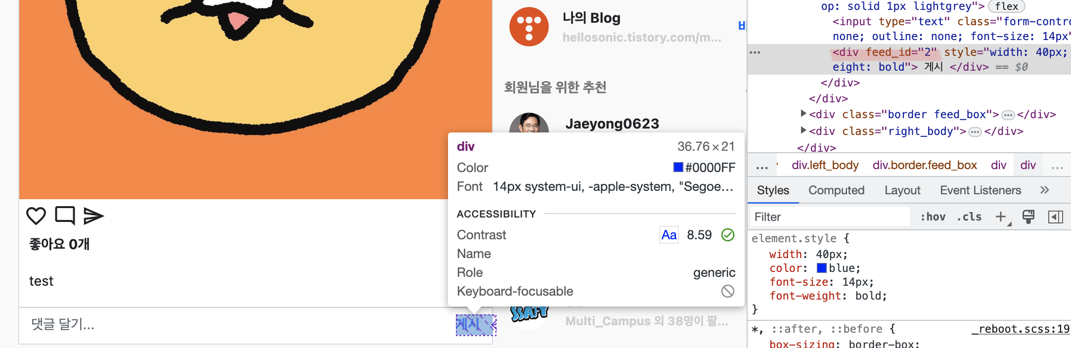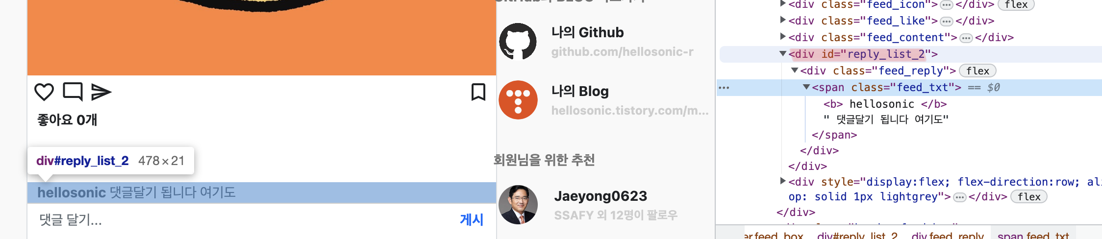 피드가 여러 개이다 보니 댓글이 어떤 피드에 달린 댓글인지 구별할 수 있는 방법이 필요하기 때문에 위와 같은 방법을 사용했다. 그렇다면 이제 "게시"에 class를 만들고, 그 class를 클릭했을 때 어떤 이벤트가 발생하도록 제이쿼리를 작성하면 된다.