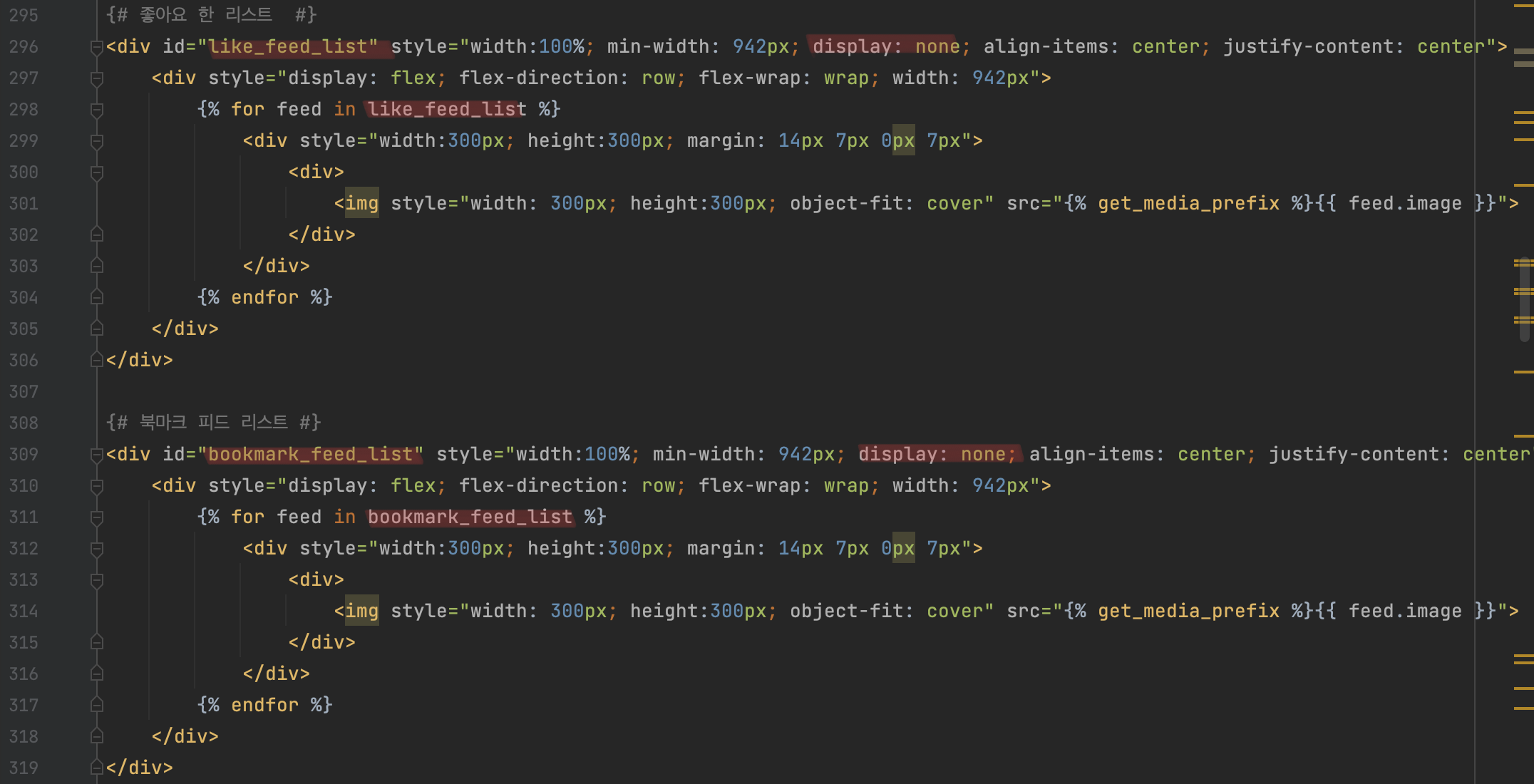 먼저 html에 내 게시물 탭에 해당하는 피드 리스트를 보여주기 위한 소스를 작성한다. 상위 div의 width를 942px로 주고 flex:wrap 속성을 통해 flex아이템(이미지)들을 복수의 행으로 표현할 수 있도록 한다. 하위 div에 피드 리스트에 있는 요소의 개수만큼 반복을 수행하여, 피드 이미지를 media폴더에서 불러와서 300px*300px 크기의 이미지로 화면을 채울 수 있도록 소스를 작성한다.
