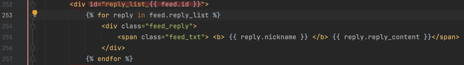 이렇게 하려면 "게시" 버튼을 눌렀을 때 feed_id가 무엇인지 알아야 한다. 다시 main.html에서 각 피드의 "게시"에 해당하는 feed_id를 만들어주기 위해 아래와 같이 수정한다.